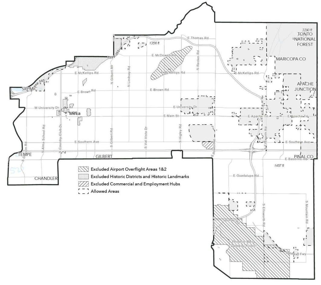 Development standards for Multiple Residence Reuses shall be based on the development standards for the highest density Multiple Residence Base Zoning District in the City of Mesa within one (1) mile of the project site in accordance with Article 2 and Article 4 of this Ordinance.
