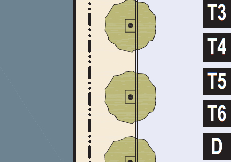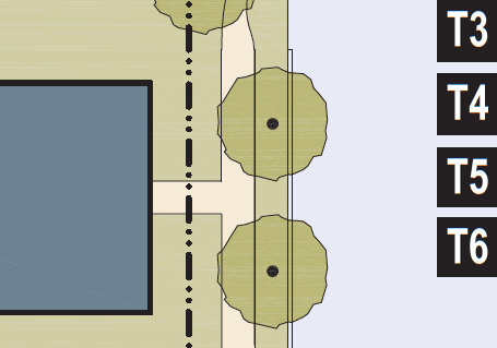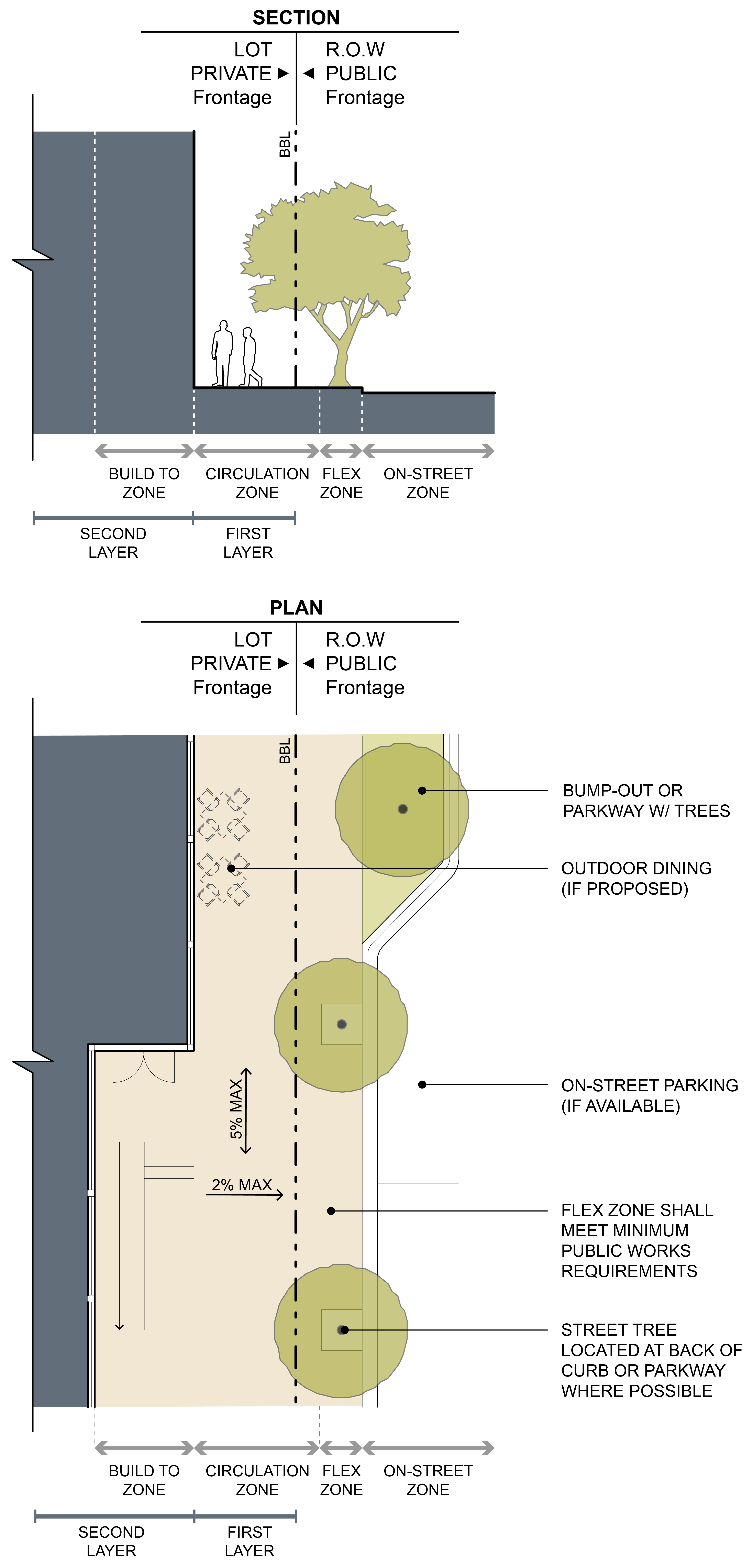 In Zones T3 and T4, D1, D2 and D3, generally sidewalks occur at the edge of the Right-of-Way. In Zones T5 and T6, sidewalks occur at the edge of the Right-of-Way and are given the additional dimensions of the 10 foot setback in the First Layer.