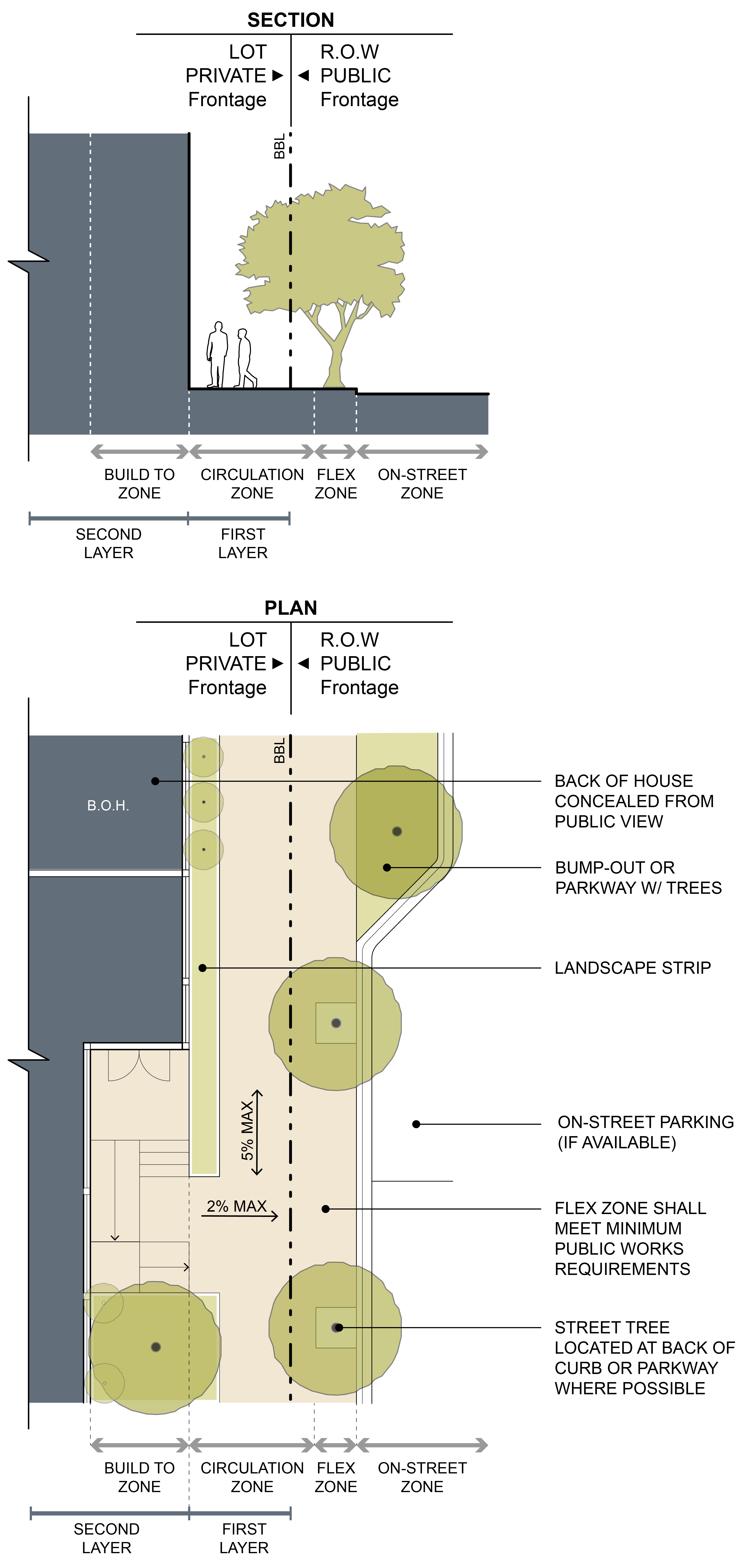 | d. Planter: The layer which accommodates street trees and other landscape |