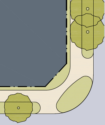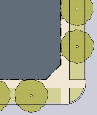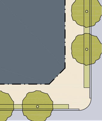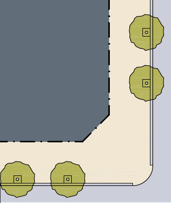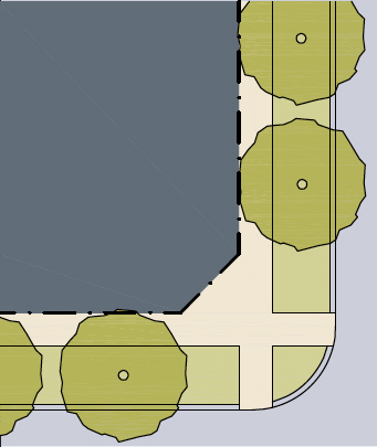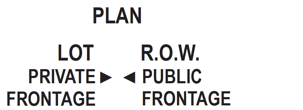 | c. (ST) For Street: This Frontage has raised curbs drained by inlets and sidewalks separated from the vehicular lanes by individual or continuous planters, with parking on one or both sides. The landscaping consists of street trees of a single or alternating species aligned in a regularly spaced allee. |