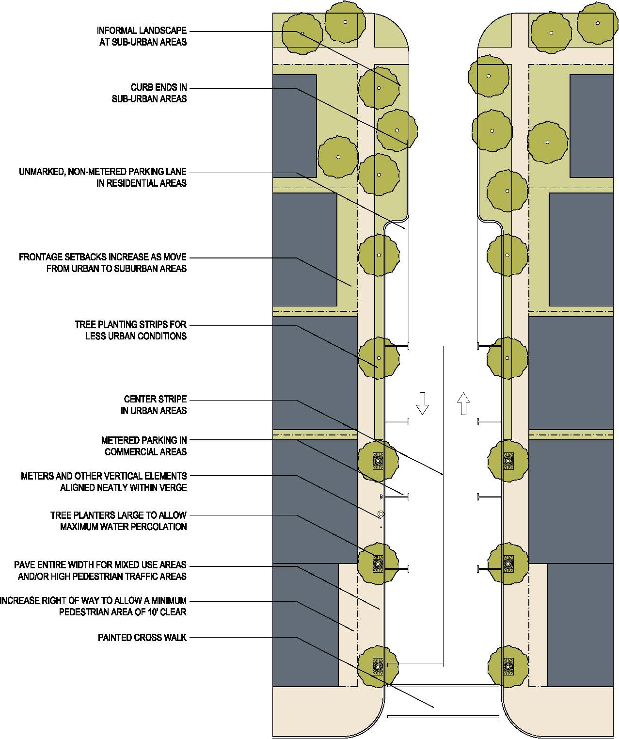 The accommodation of bicycles and transit requires detailed response to the existing Thoroughfare condition and thus is not illustrated specifically here.