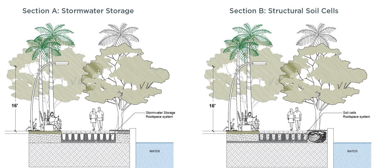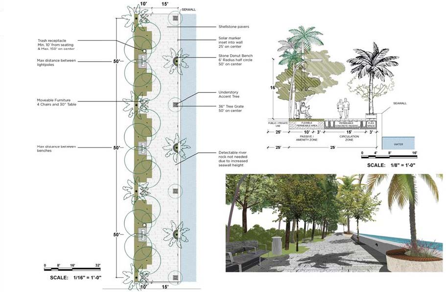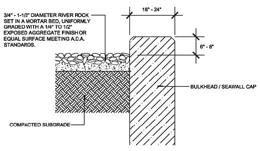 Similar to the Central Walk where the detectable river rock has been removed and the seawall has been raised to create a seating bench. Additional seating shall be provided in the form of half donut stone benches wrapping palm trees every fifty feet (50’).