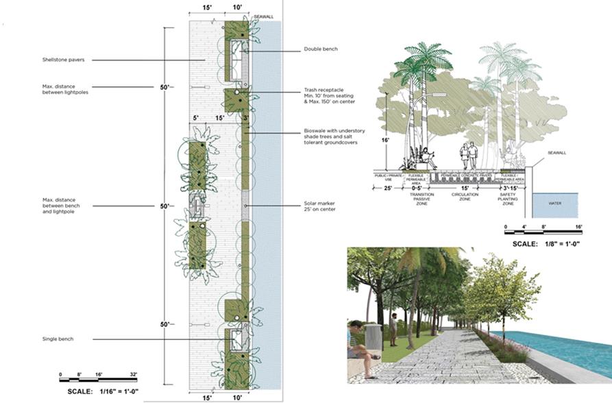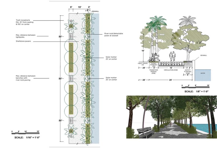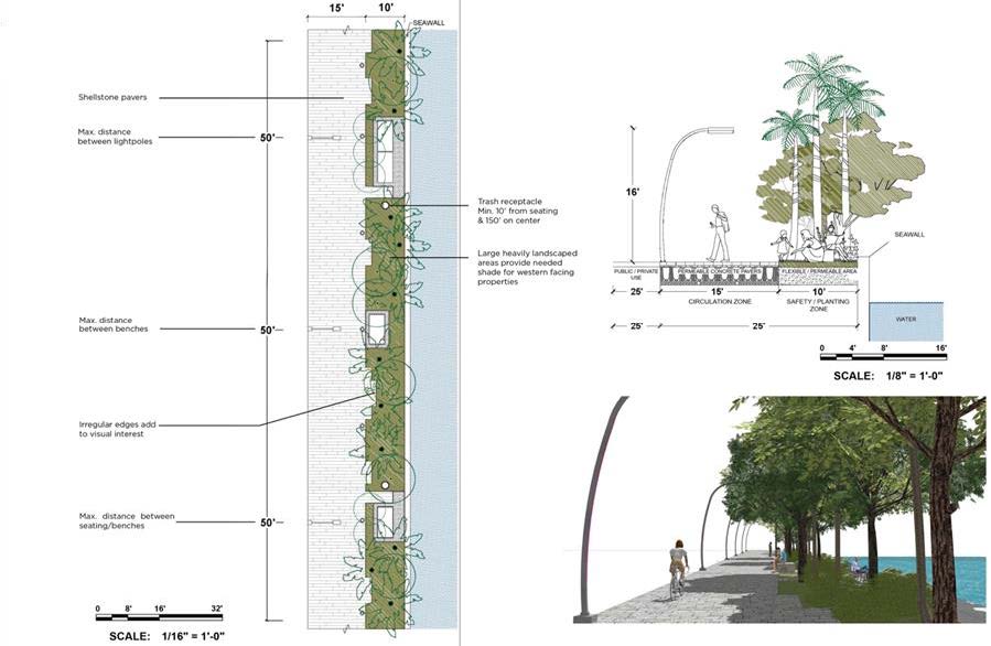 This Section presents guidelines for how promenade design components such as circulation paths, lighting, planting, public art, water access, and seating can be configured to provide continuous circulation, create a unified identity while promoting diversity of experience.