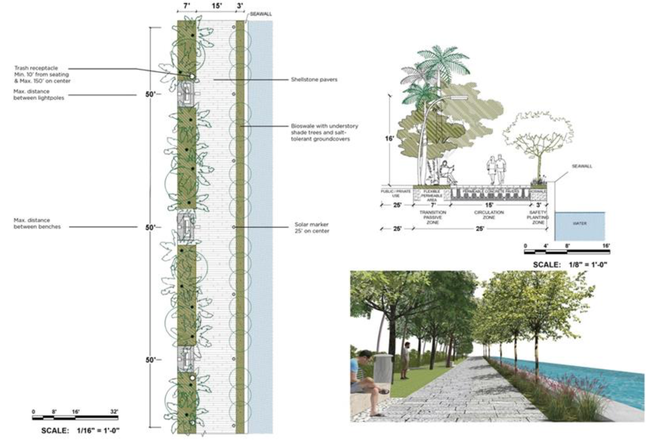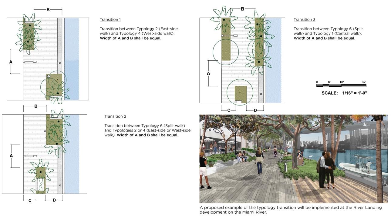 Walkway typologies are intended to allow flexibility in spatial configurations, reflecting, and adapting to adjacent conditions along the seawall, shoreline, public open space, and private development. Spacing regarding furnishings and landscape may either be at maximums shown in illustrations or based on performance and utility as described in Sections 6 and 7. The promenade shall have the following configurations: