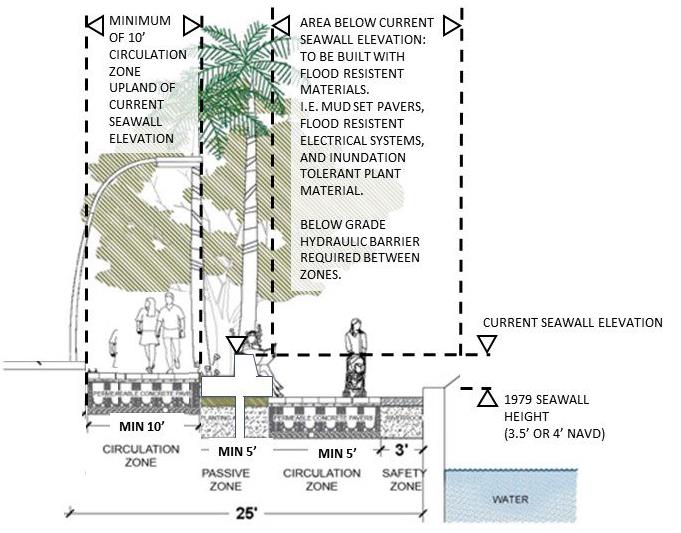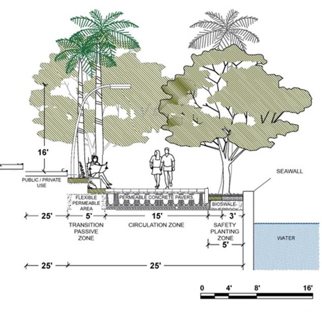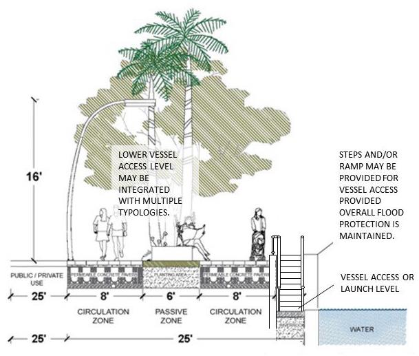 Walkway typologies are composed of zones including Seawall Zone, Safety Buffer Zone, Circulation Zone, and Passive Zone. Each individual zone shall serve its specific role as described within this Section.