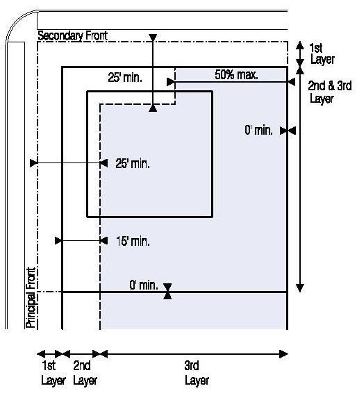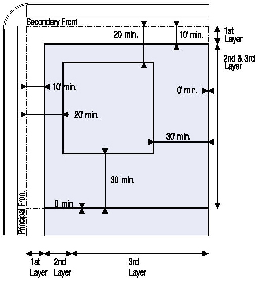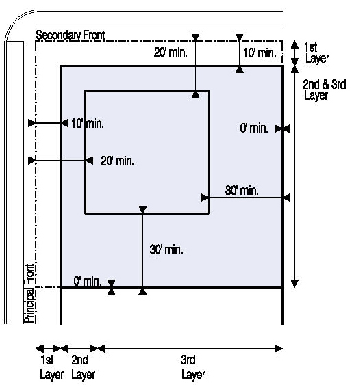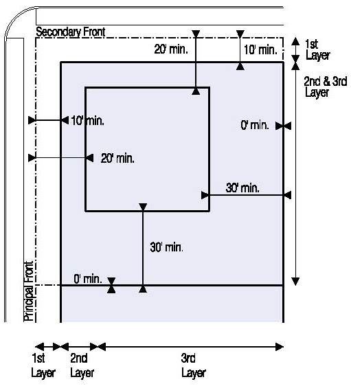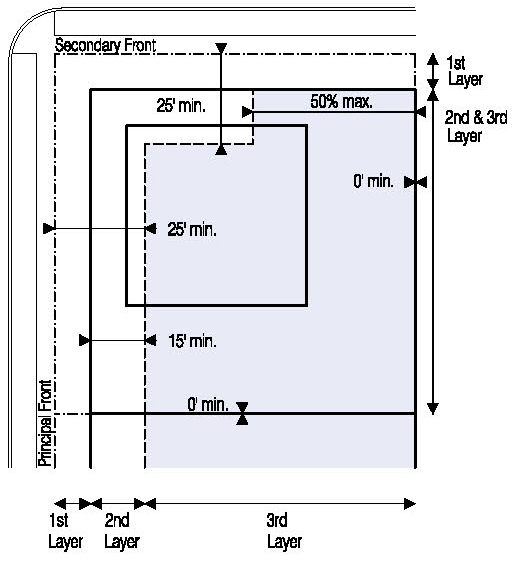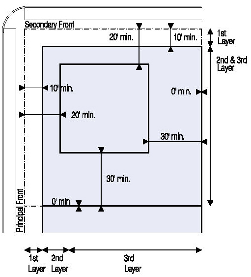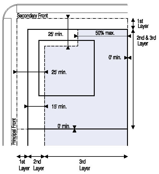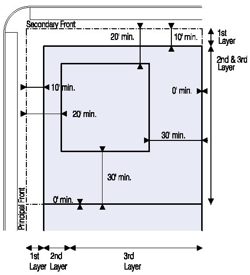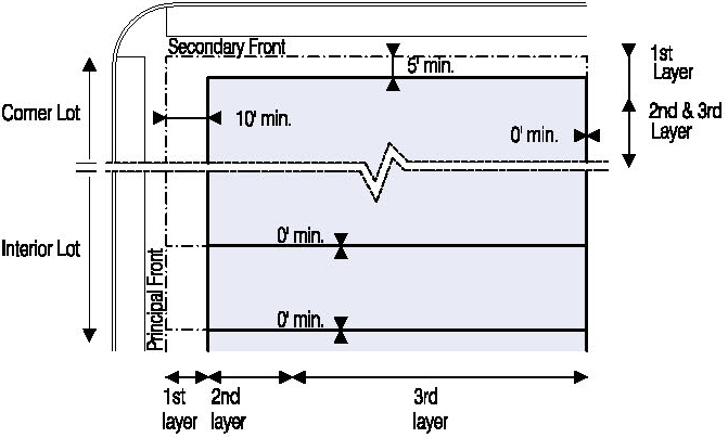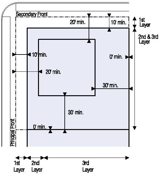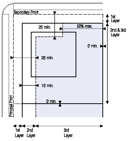 Located in the second or third Layers and follow the setbacks for Ancillary Buildings as shown in Illustration 5.3.