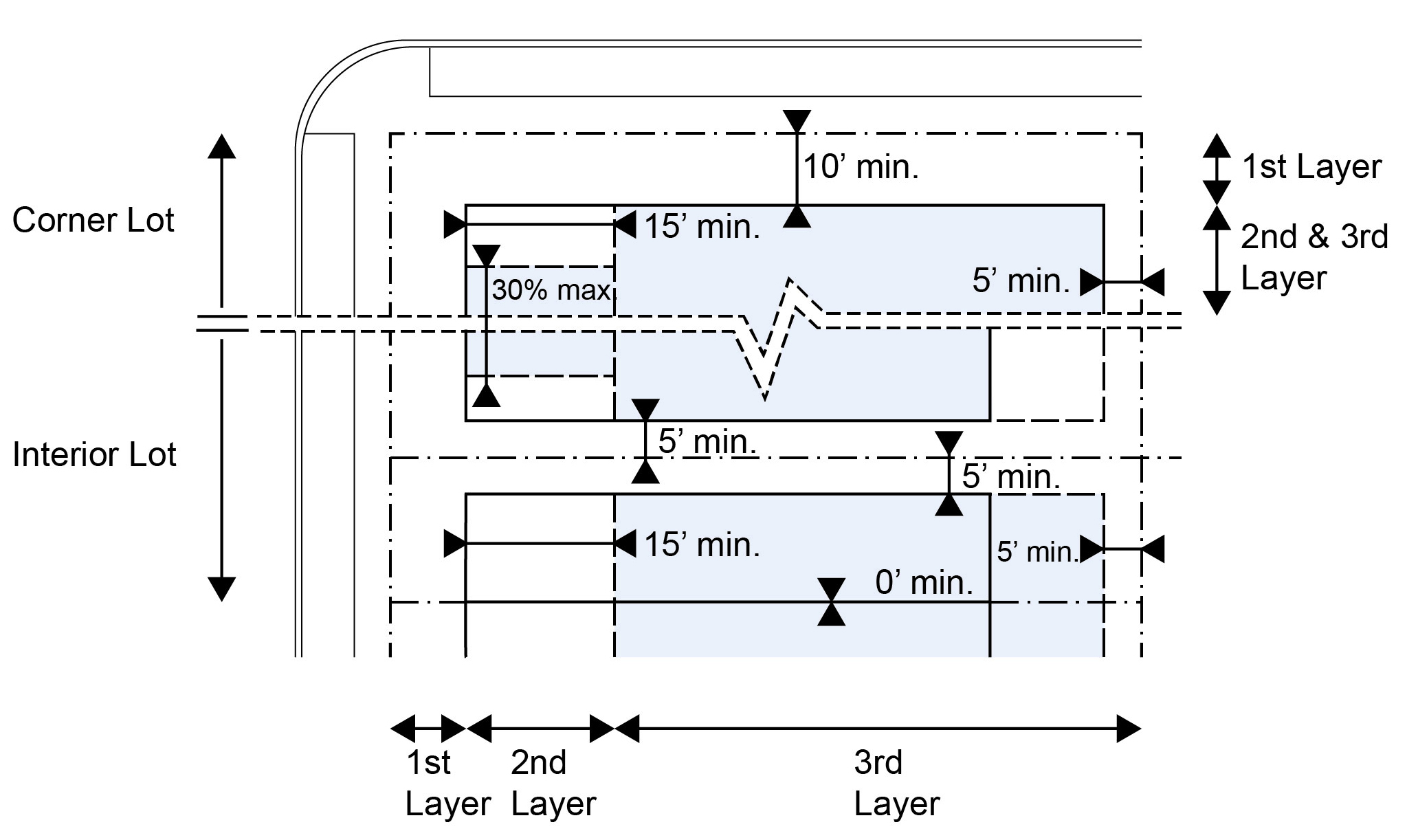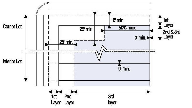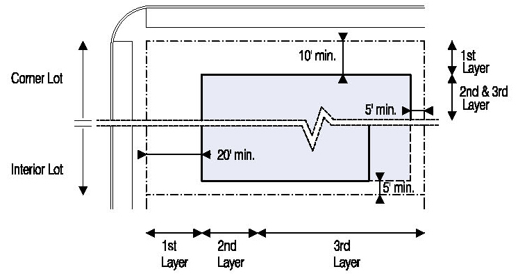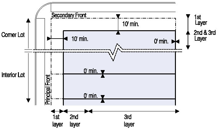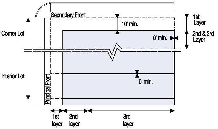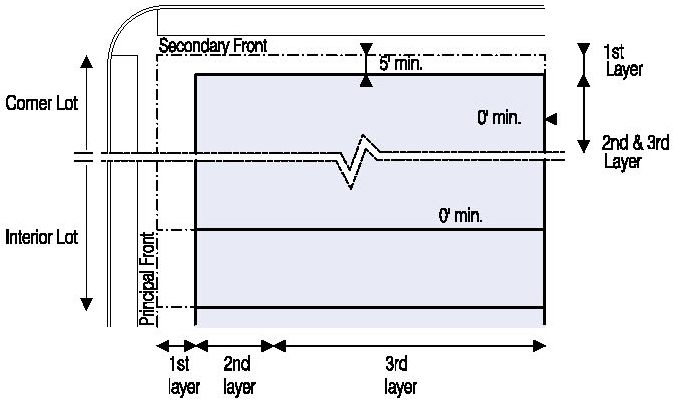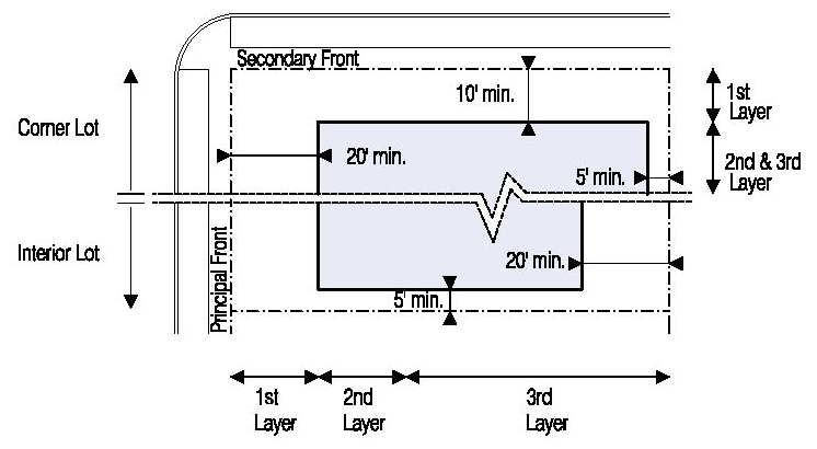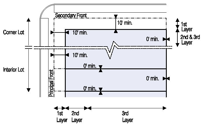 Located in the second or third Layers and follow the setbacks for Ancillary Buildings as shown in Illustration 5.3.