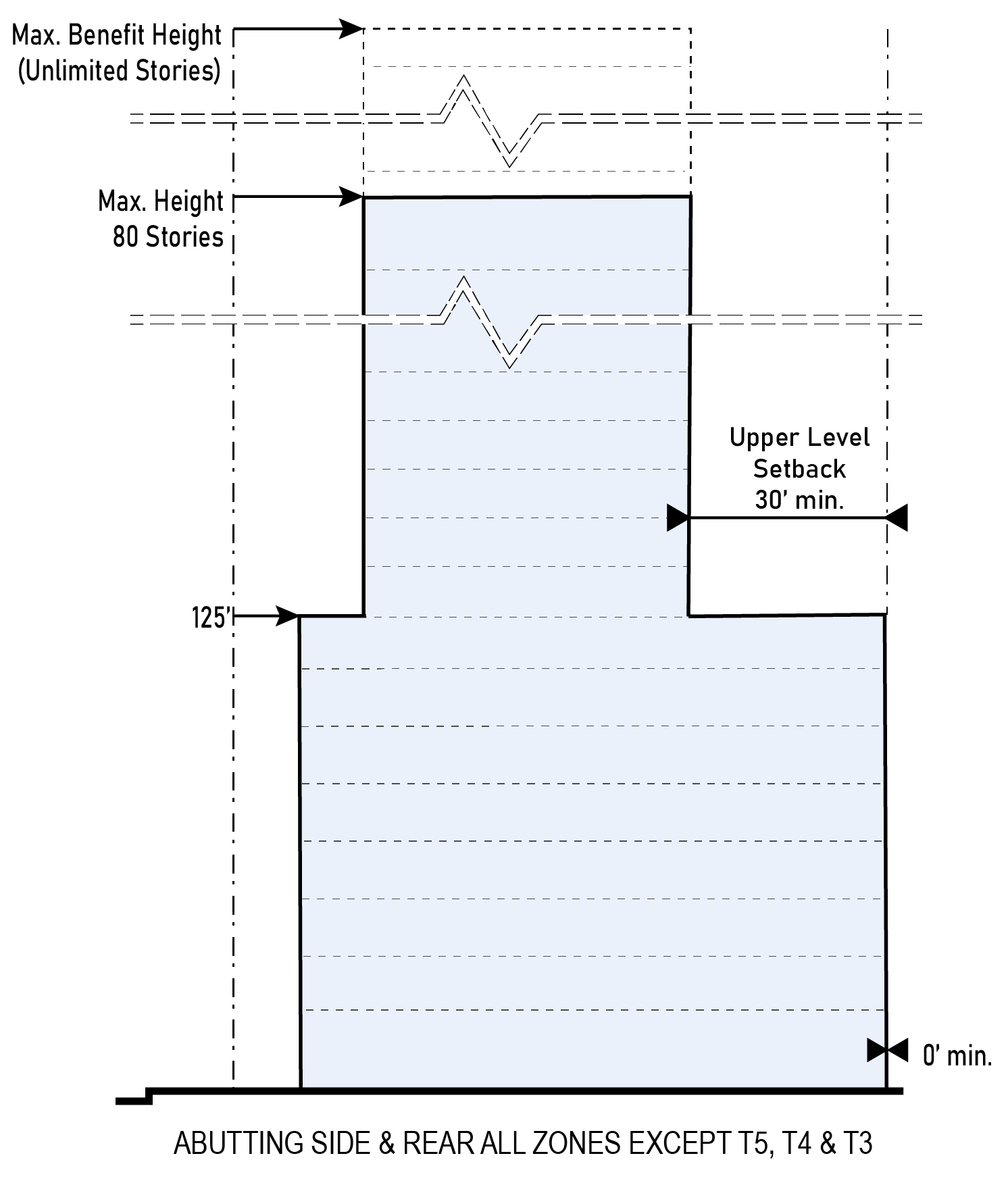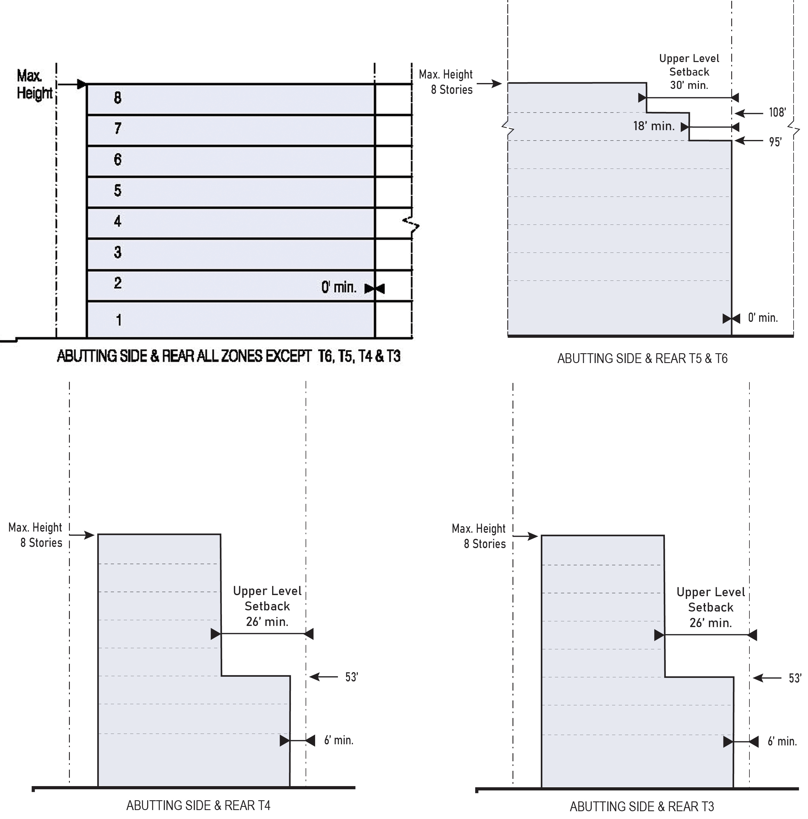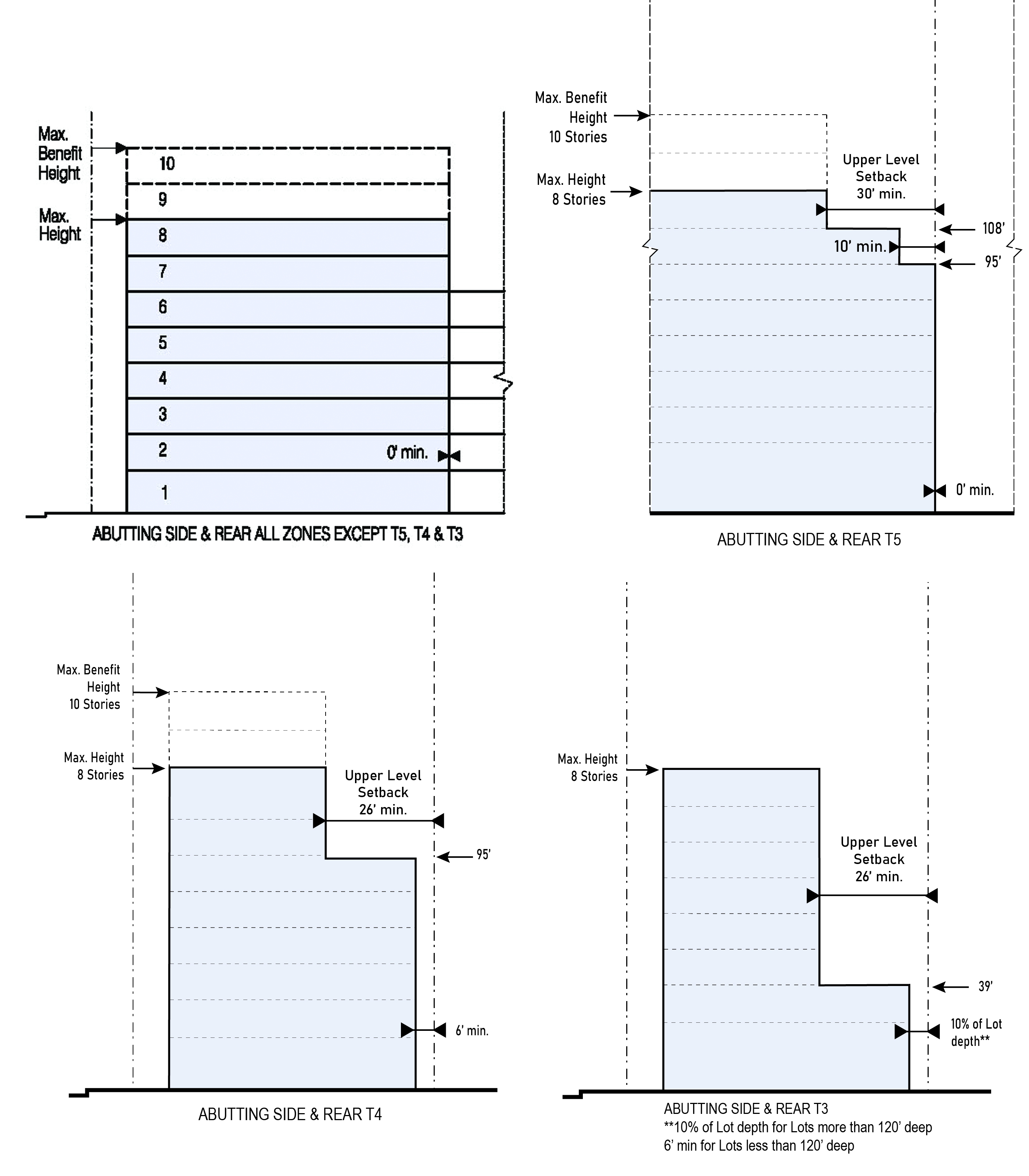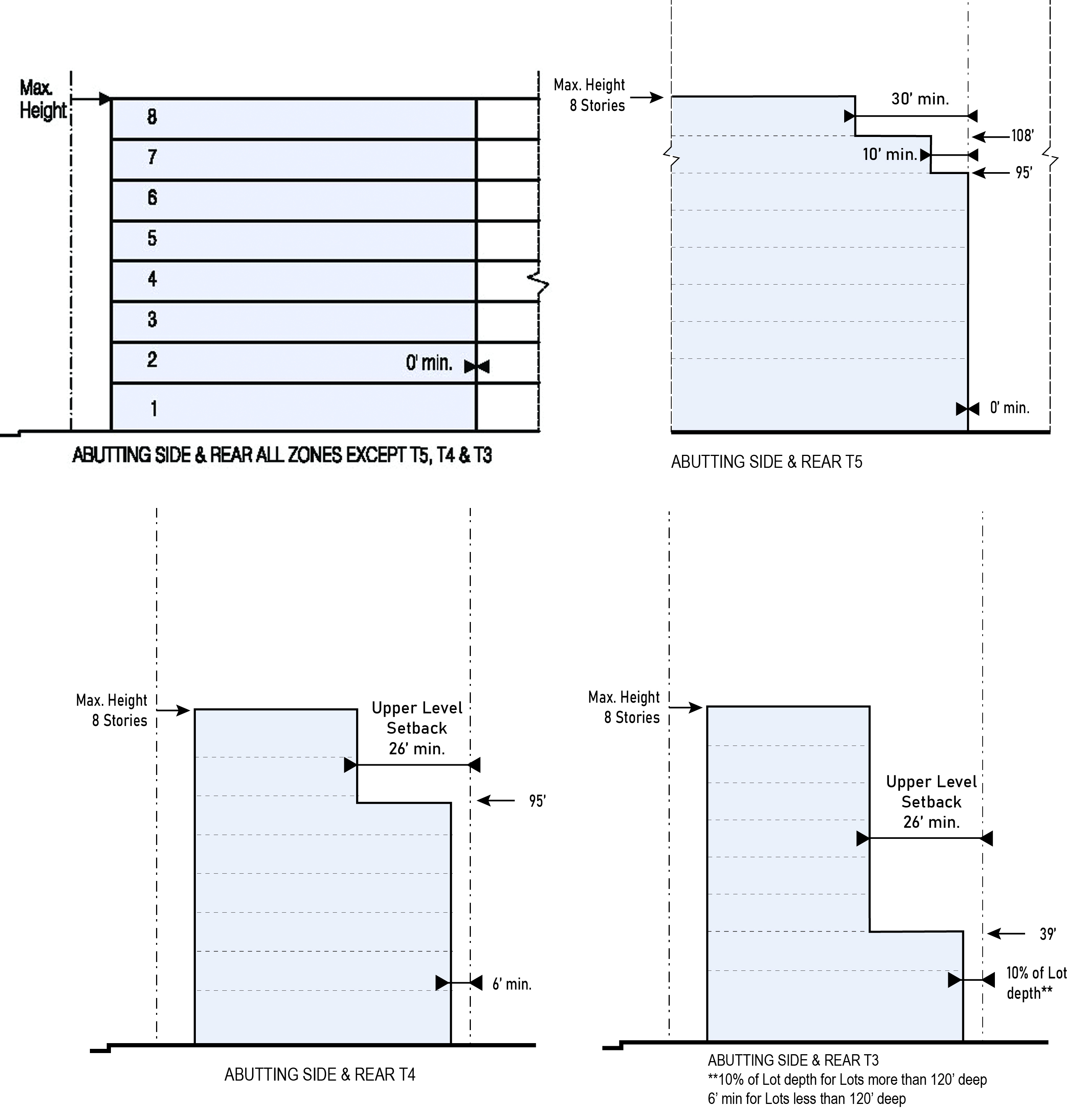 | e. Abutting Side or Rear T5 | 0 ft. min. up to 95 ft. in height 10 ft. min. above 5th Story from 95 ft. to 108 ft. in height 30 ft. min. above 108 ft. in height | |