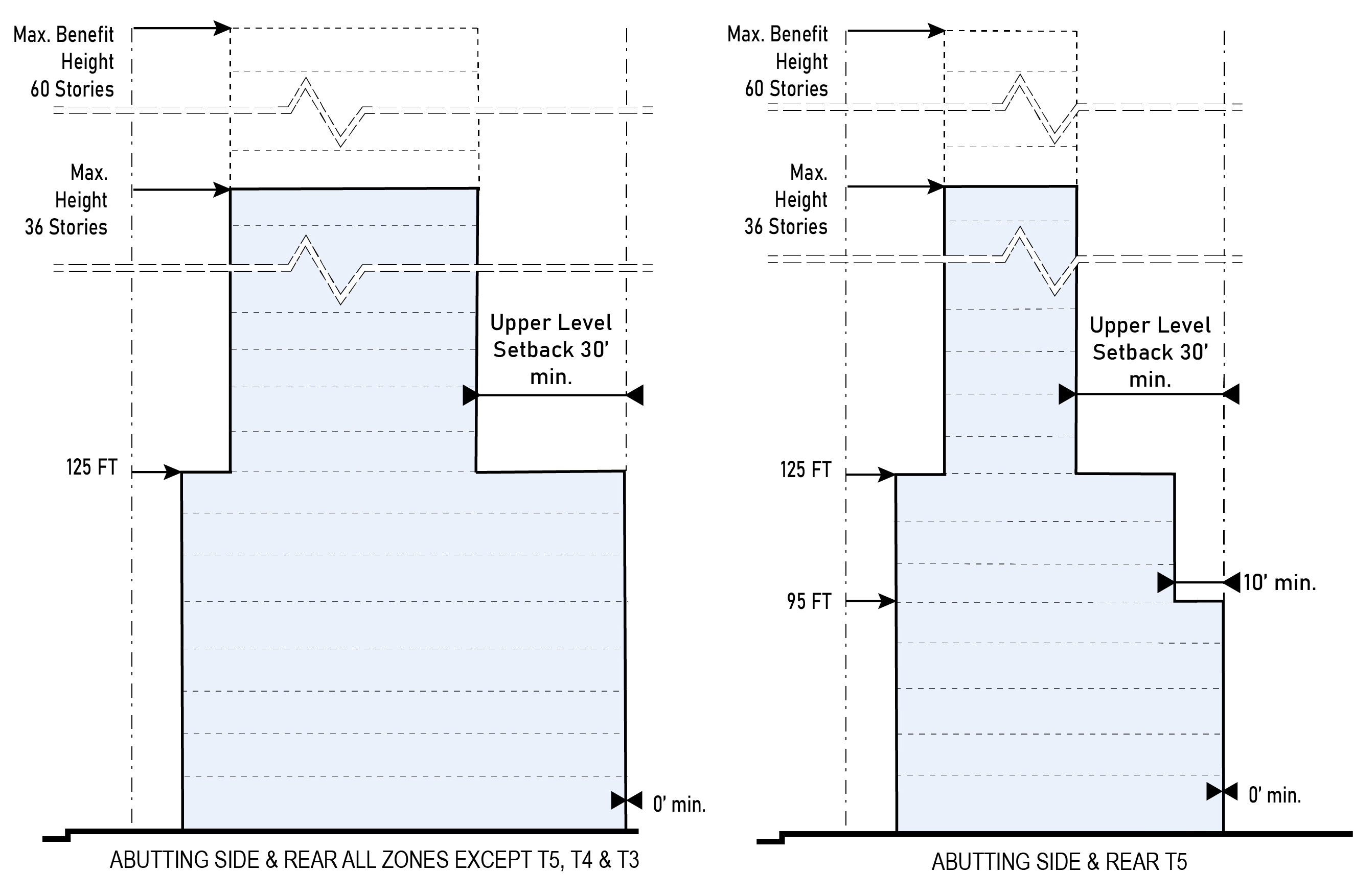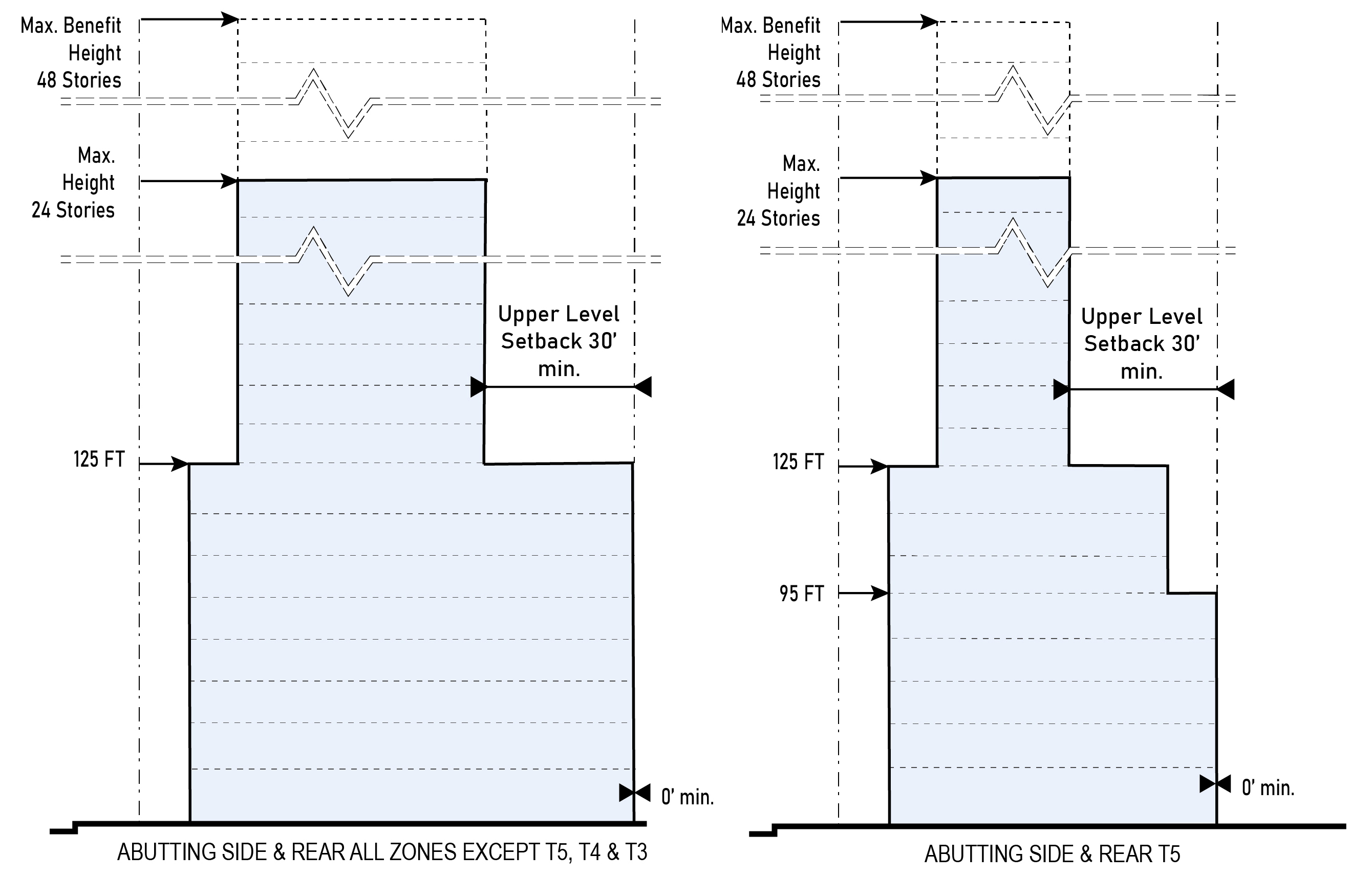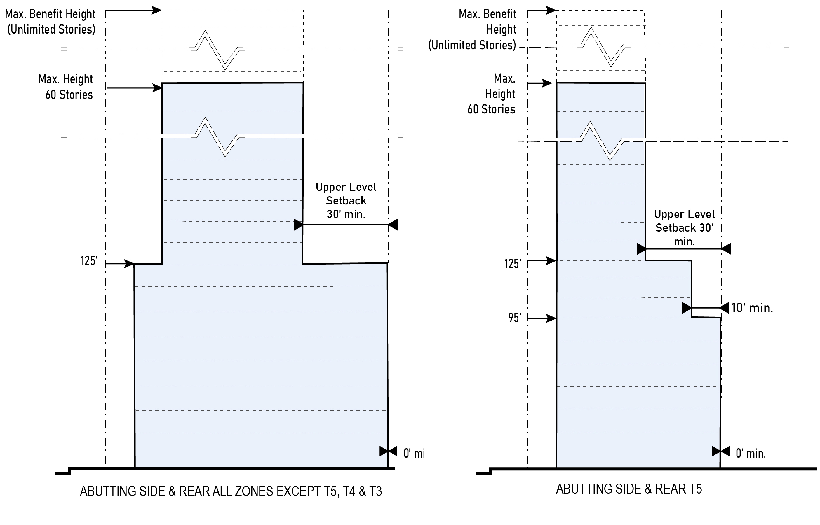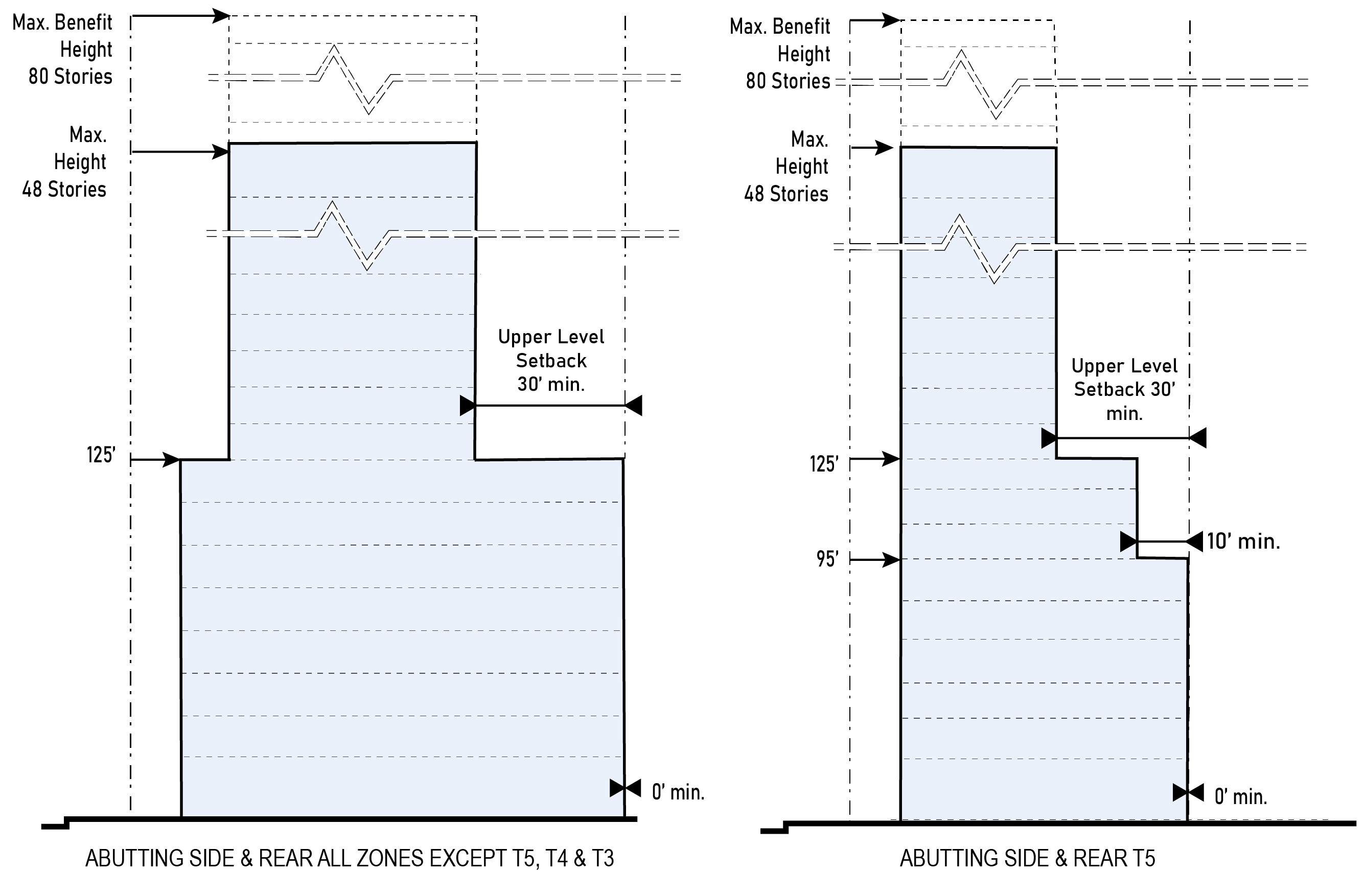 | e. Abutting Side or Rear T5 | 0 ft. min. up to 95 ft. in height 10 ft. min. above 5th Story from 95 ft. to 108 ft. in height 30 ft. min. above 108 ft. in height | |