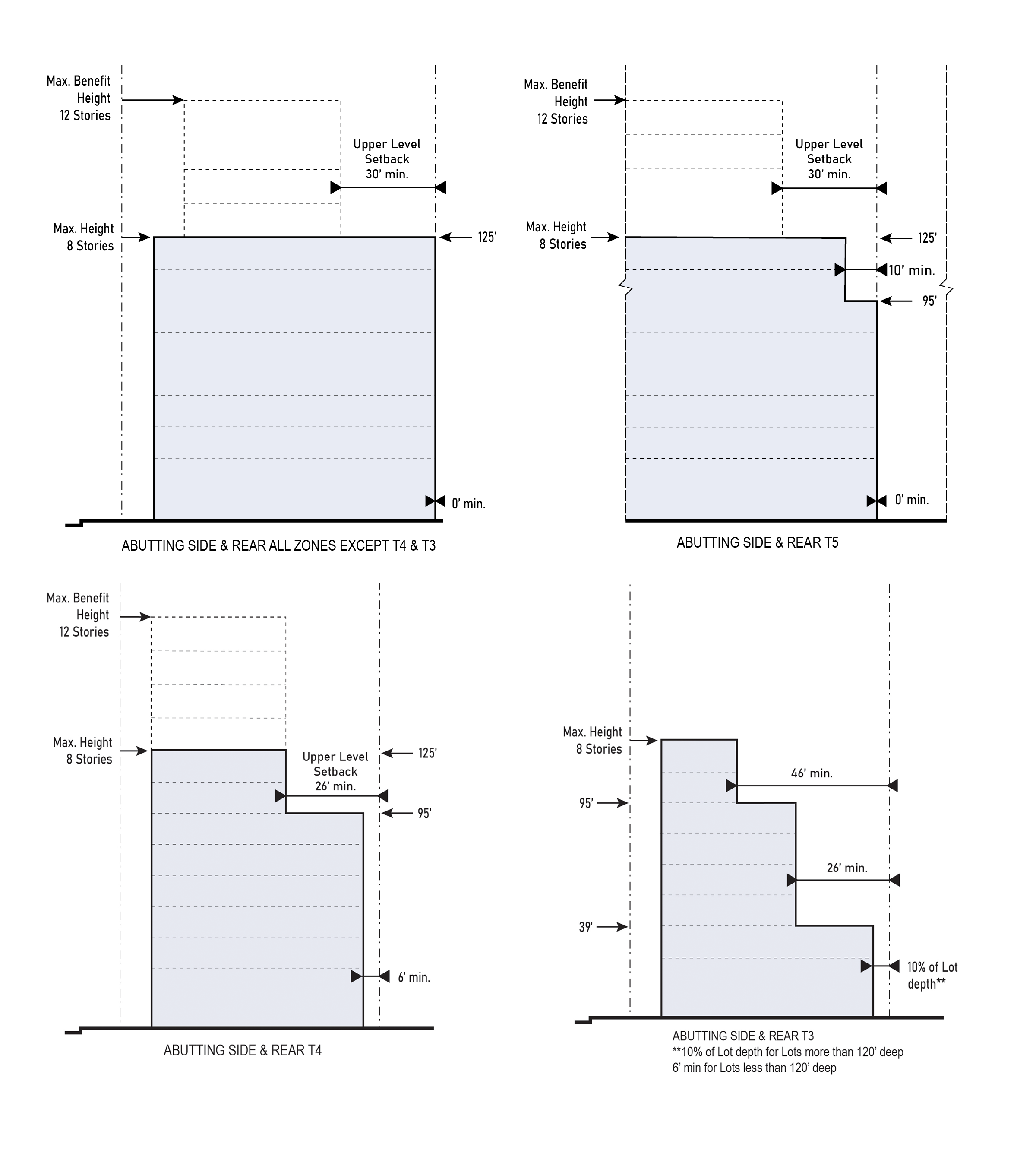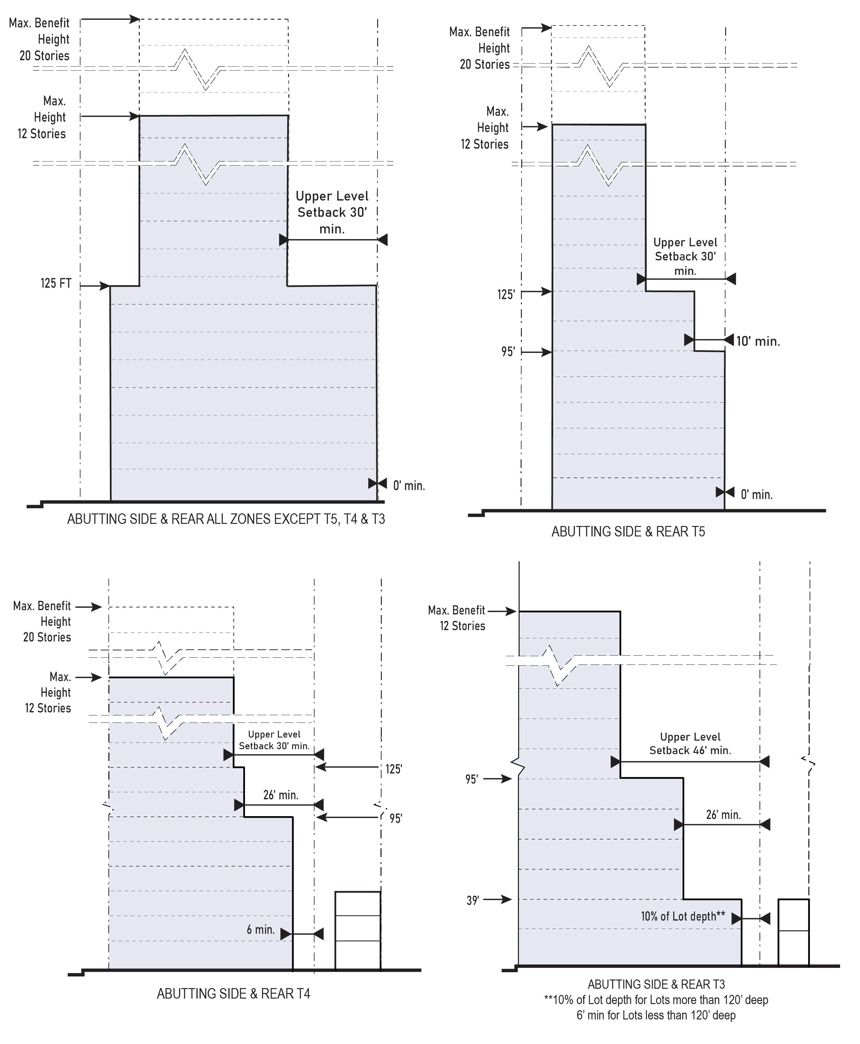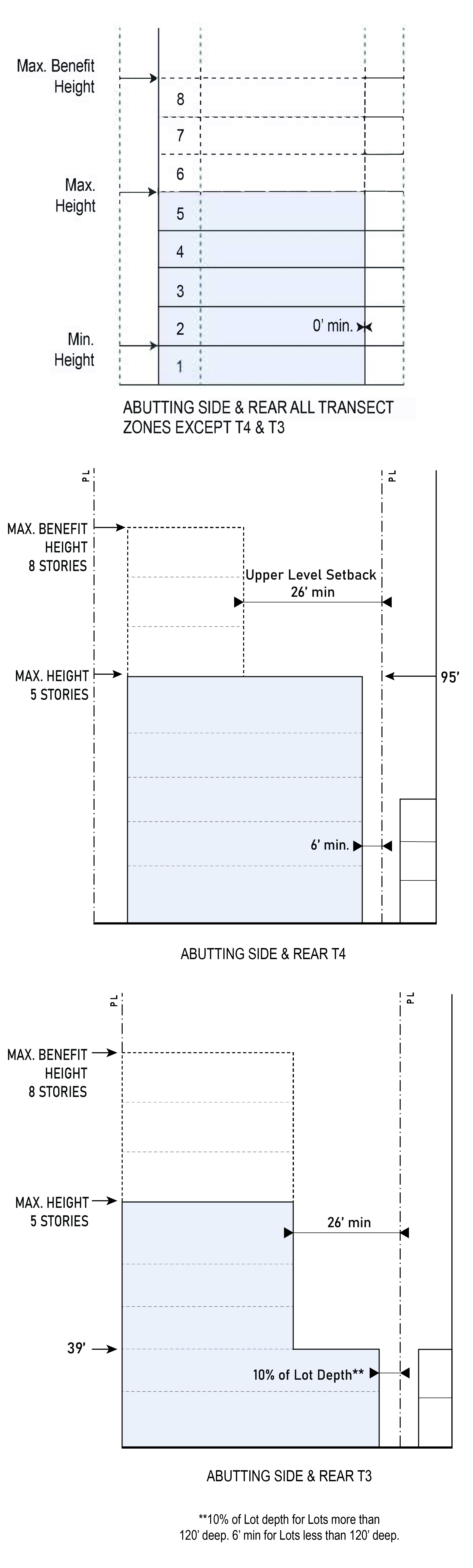 | Abutting Side or Rear T3 | 10% of Lot depth** min. up to 39 ft. 26 ft. min. from 39 ft. to 95 ft. in height 46 ft. min. above 95 ft. in height | |