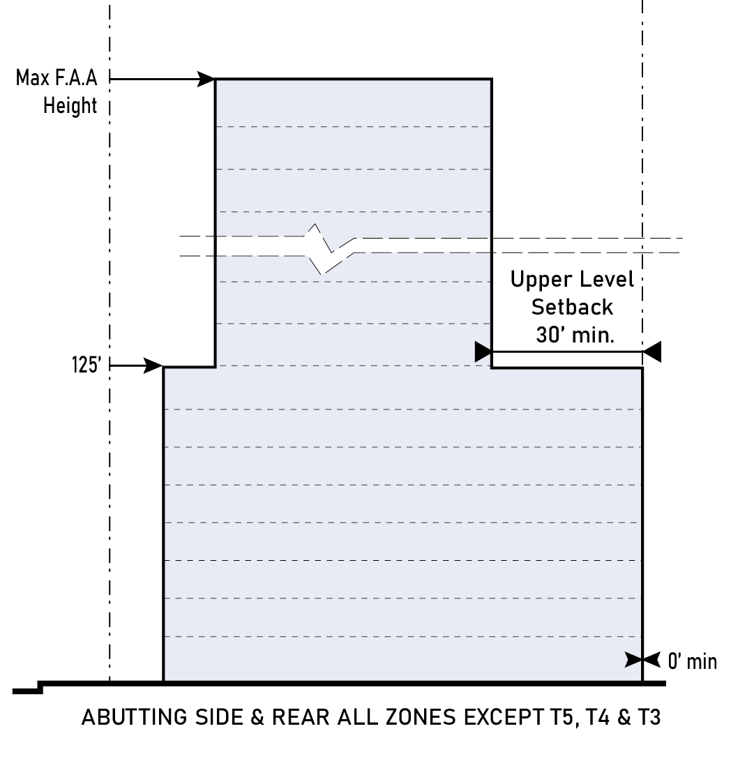| e. Abutting Side or Rear T5 | 0 ft. min. up to 95 ft. in height 10 ft. min. from 95 ft. to 108 ft. in height 30 ft. min. above 108 ft in height | |