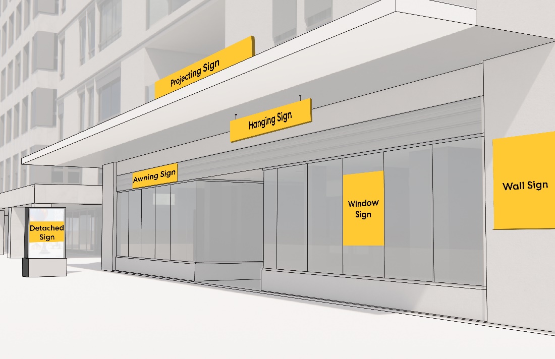 | Maximum quantity per frontage | Multiple signs for the same establishment may be permitted through the design review or certificate of appropriateness process if the aggregate sign area does not exceed the largest maximum permitted area | One wall, projecting or detached sign. | |