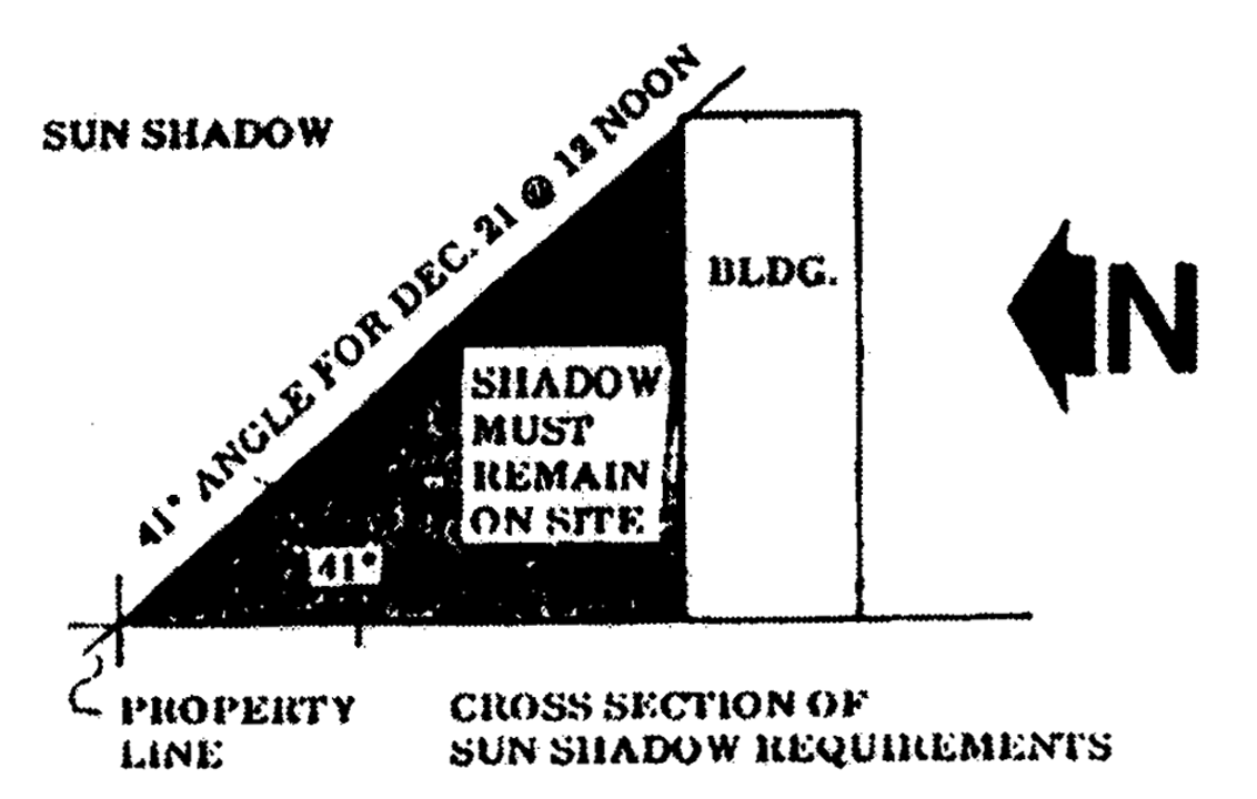 On sites which abut dedicated rights-of-way of one hundred (100) feet or more, each proposed building or structure which exceeds one hundred (100) feet in height shall be designed and situated such that the shadow created by the sun at 12:00 noon on December 21 (a sun angle of forty-one (41) degrees) will not fall on any adjacent property except for public road rights-of-way. Shadow studies shall be provided to the Department. Buildings or structures may be proposed to any height except as controlled by this shadow provision and other provisions in the Code, such as floor area ratio, setbacks, airport regulations, etc. For all other sites, no building or structure or part thereof shall be of a height greater than the width of the widest street upon which such building abuts, unless approved for additional height as a result of public hearing. (See following sketch.)