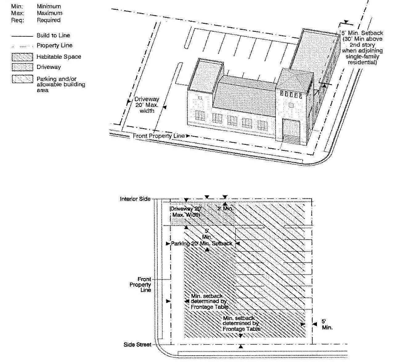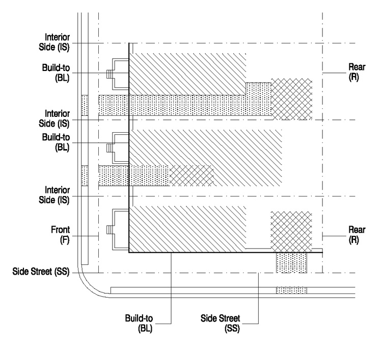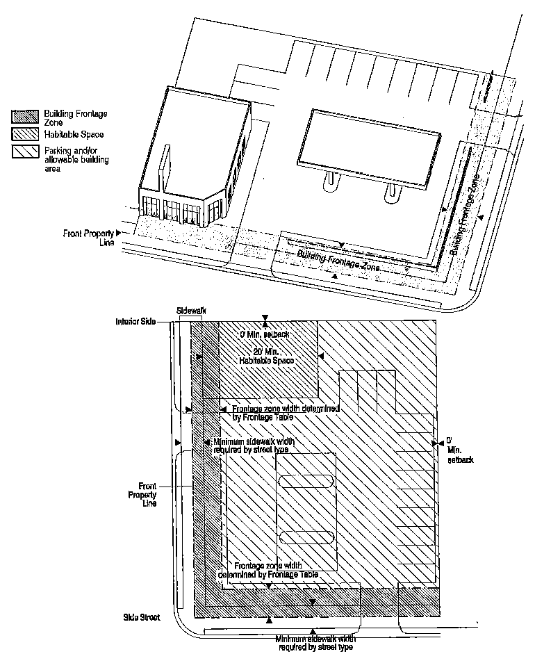Building Frontage Zone: The portion of a lot adjoining a street or right-of-way. The width of the building frontage zone is established by the applicable building placement diagram or frontage table.