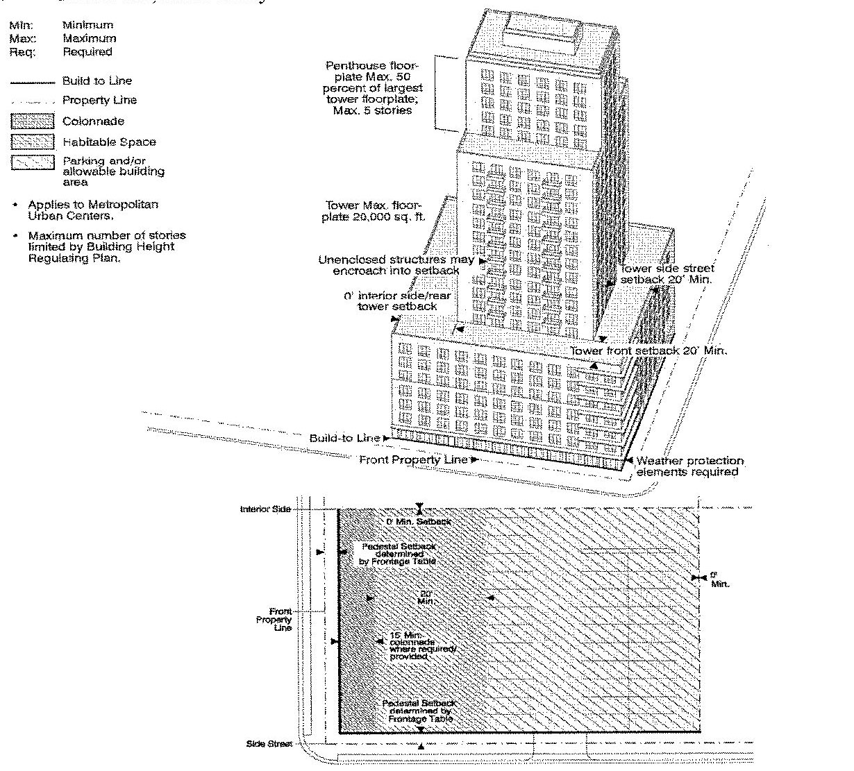 Pedestal: The bottom portion of a building that creates the street frontage.