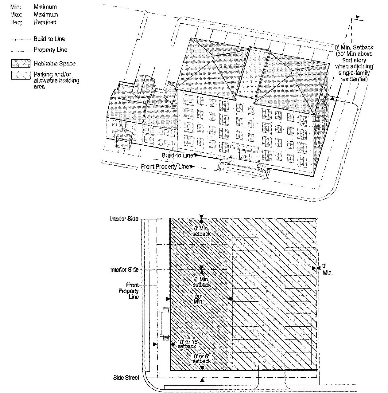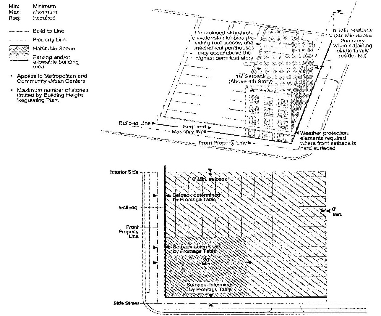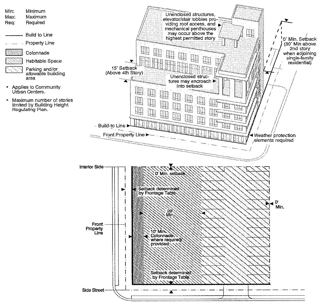 Building placement diagrams: Diagrams that provide a schematic representation of the permissible footprints and profiles of structures by land use and Sub-district.