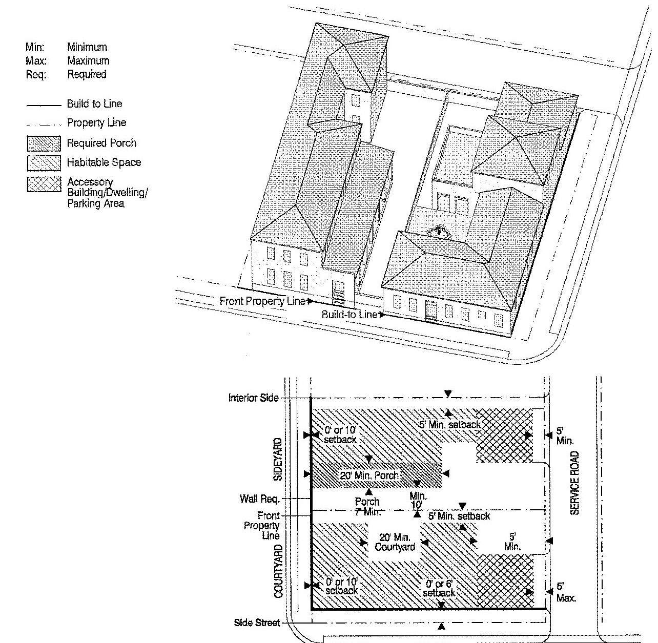 Forecourt: The front yard area defined by three sides of the principal building and a low garden wall parallel to the street making the space suitable for gardens and outdoor seating (see Fig. 3). At street corners, the forecourt edges are defined by two (2) principal building walls and a low garden wall parallel to the street (see Fig. 4).