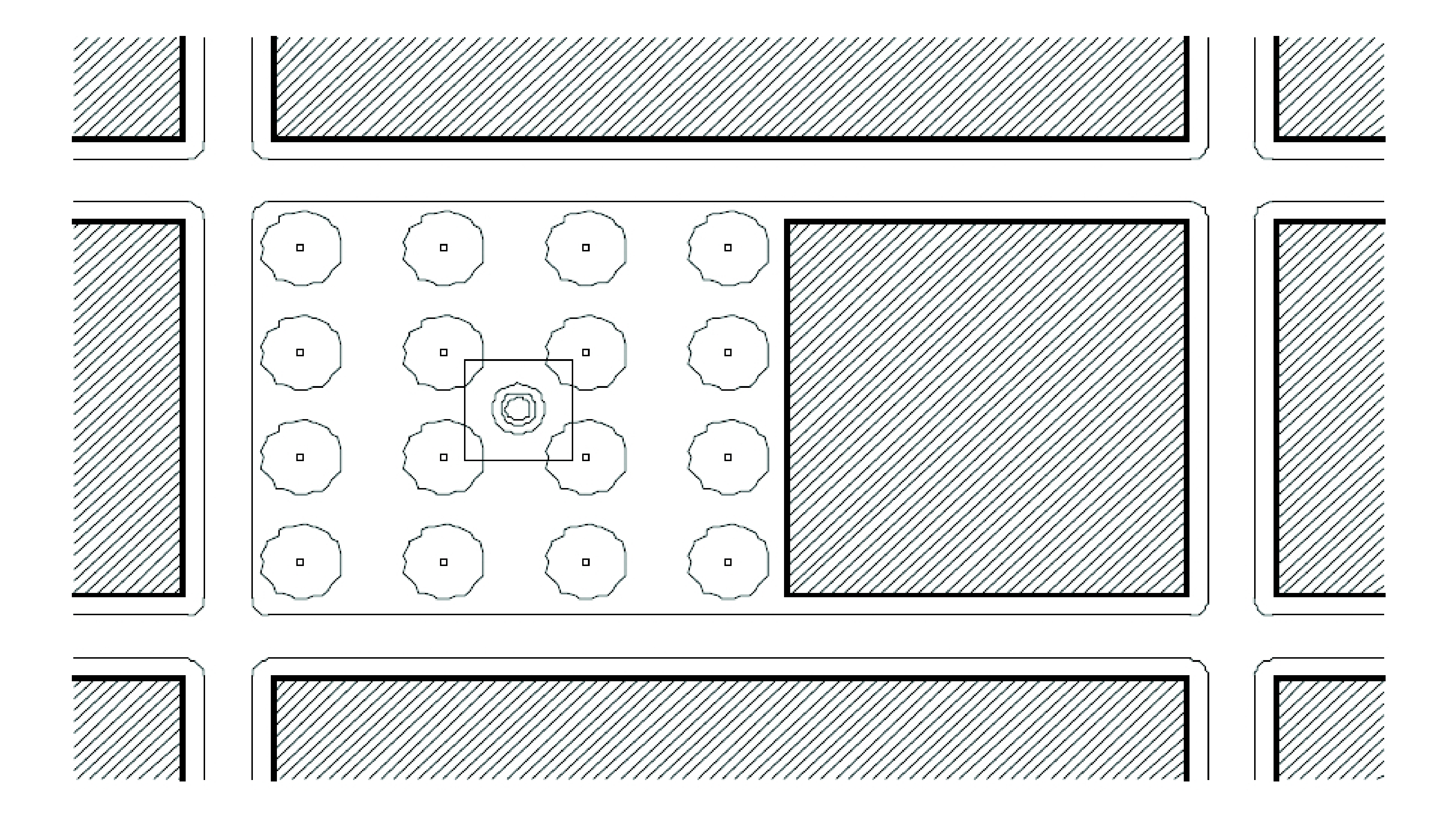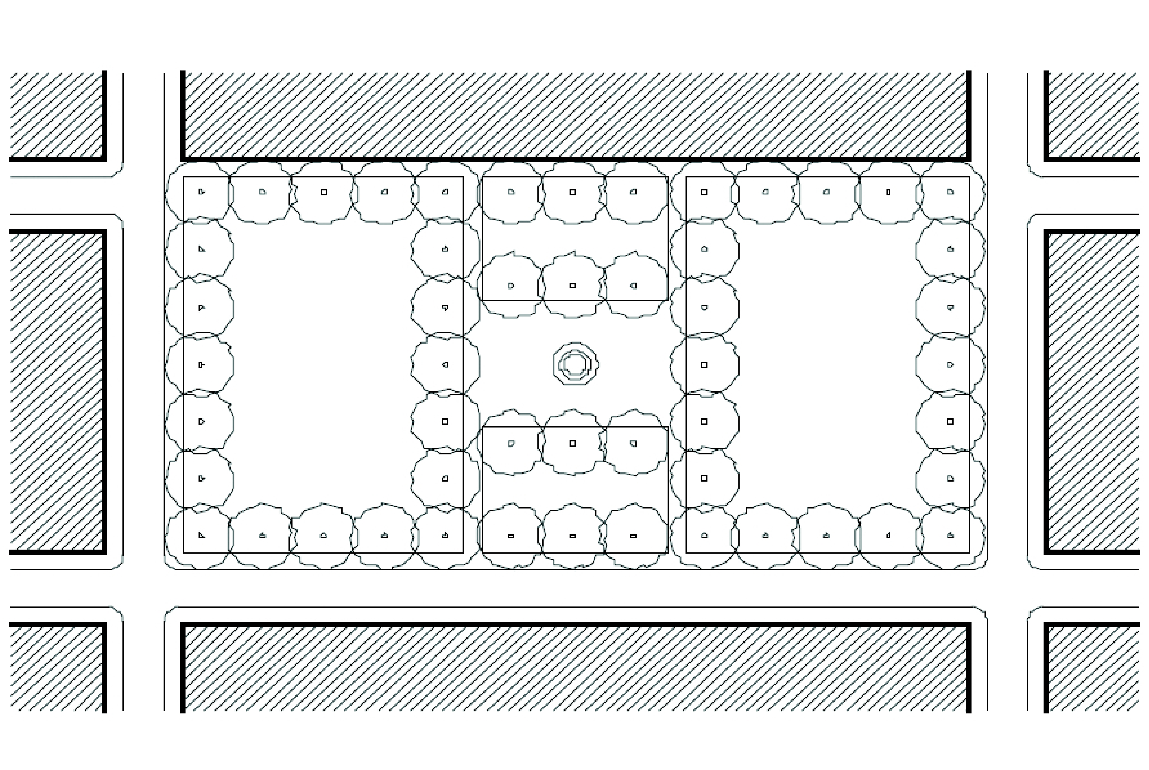 Plaza: An outdoor open space fronted by mixed-use, retail, and office uses. A minimum of fifty (50) percent and a maximum of seventy-five (75) percent of the plaza's area, exclusive of dedicated streets, shall be hard surfaced. The landscape of plazas shall consist primarily of hard-surfaced areas, permanent architecture or water-oriented features, and trees that are placed in an orderly fashion and that are regularly spaced as shown below (see Fig. 6).