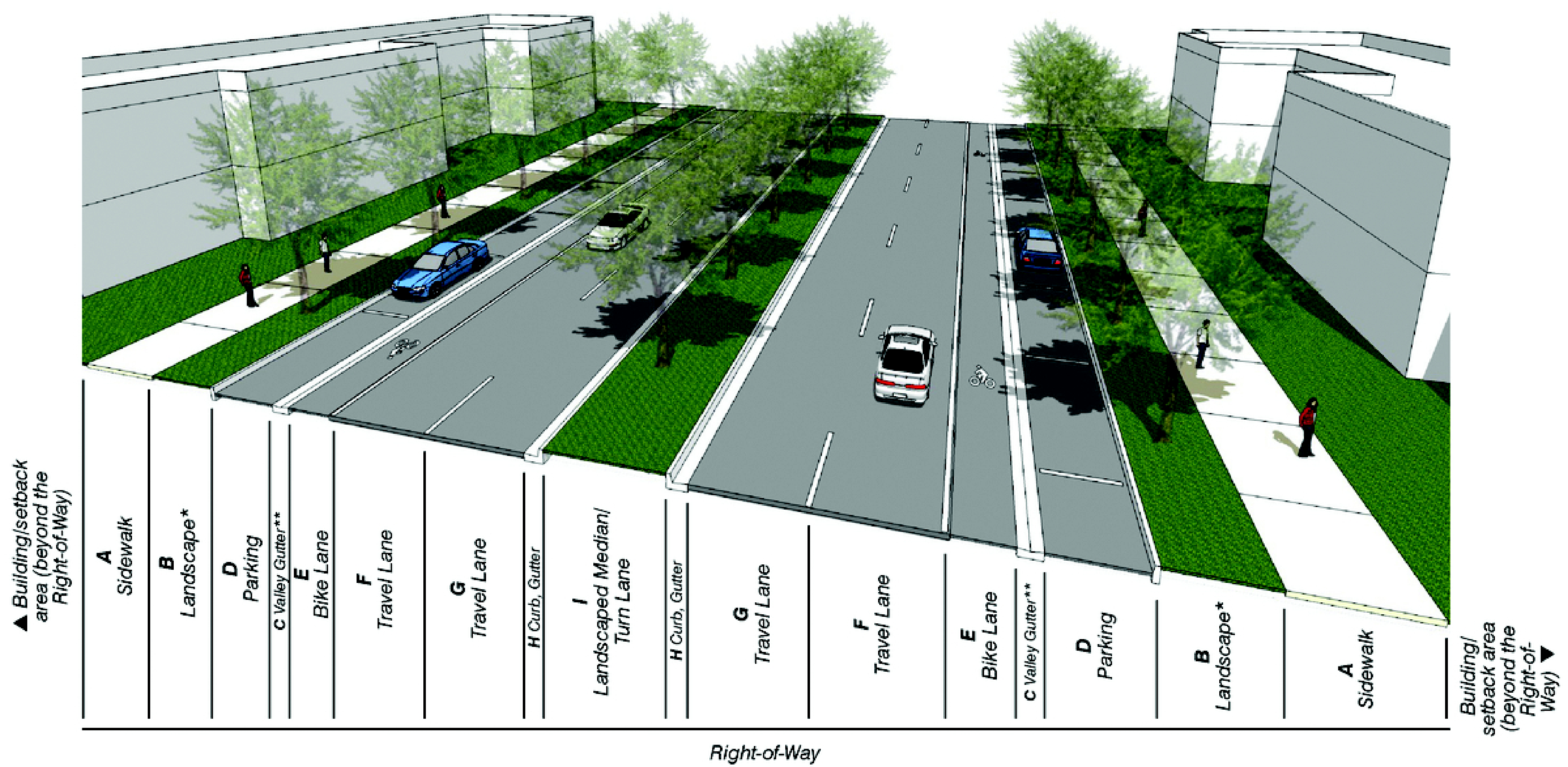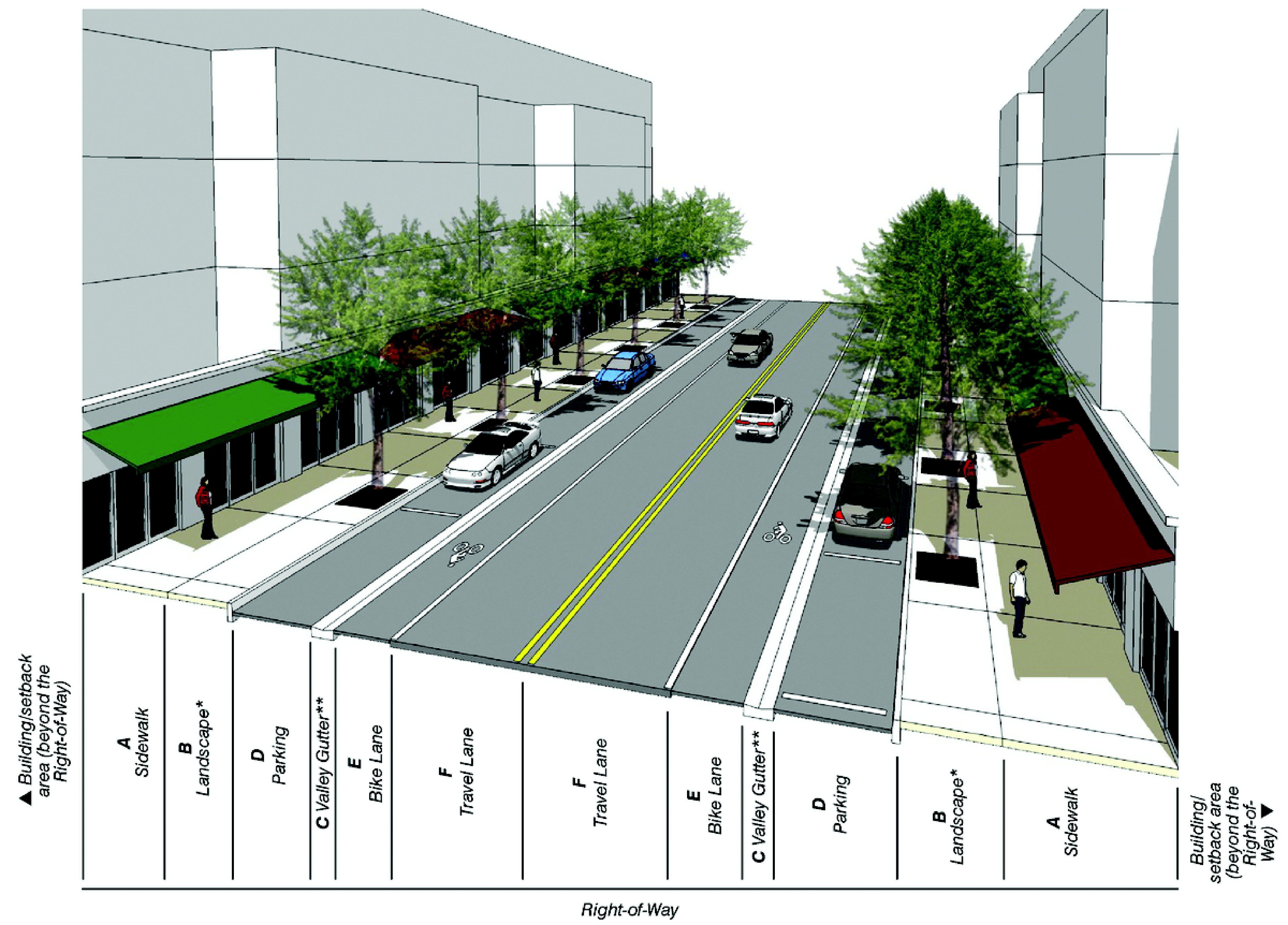 Street cross-sections, including adjacent buildings and open space.