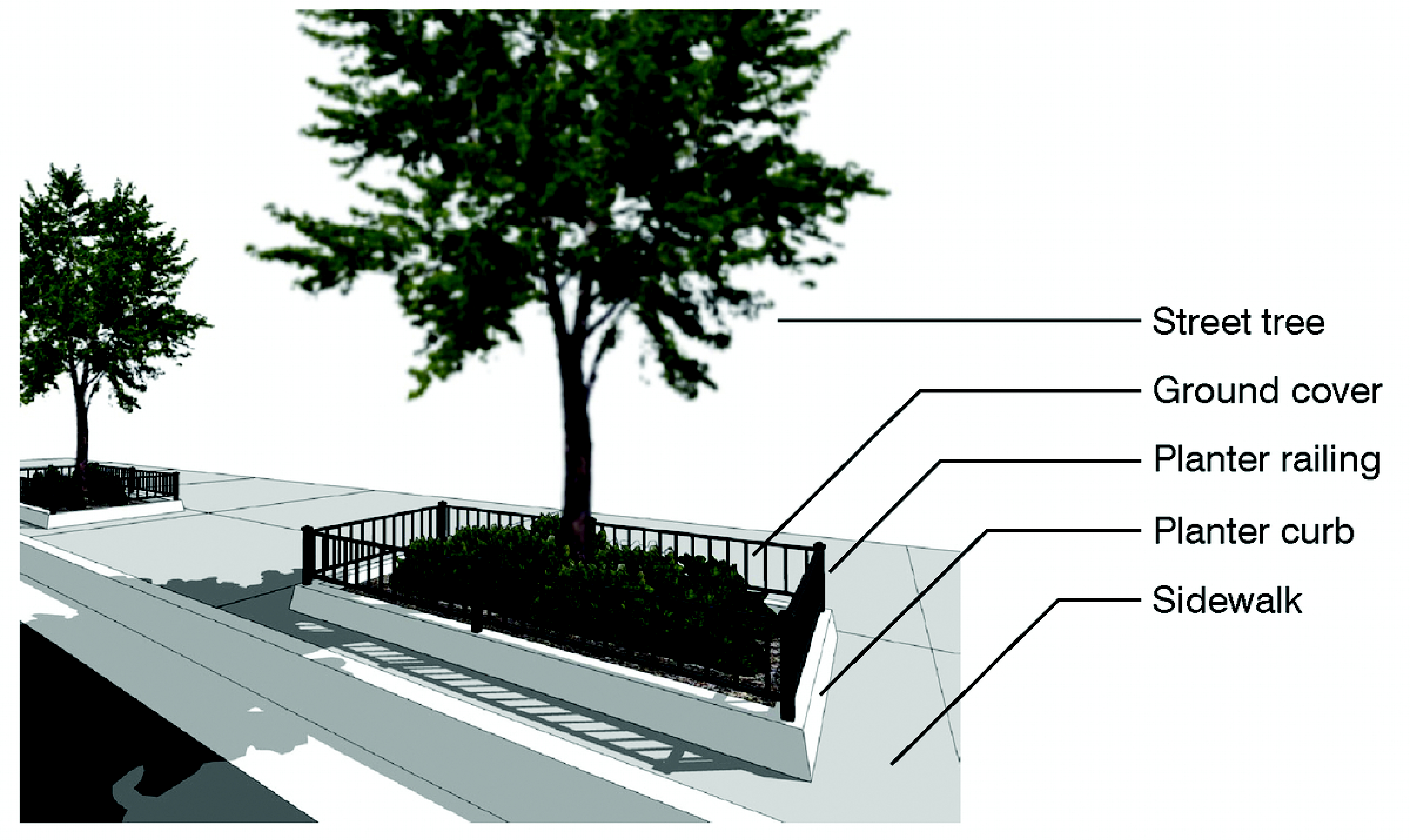 Requirements for street trees, greens, plazas, squares and medians;