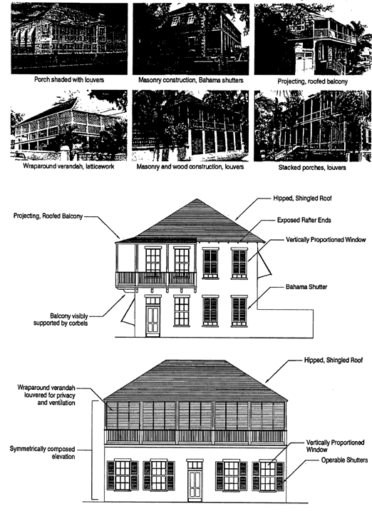 Shading devices such as Bahama shutters, louvers, latticework, and projecting roof eaves