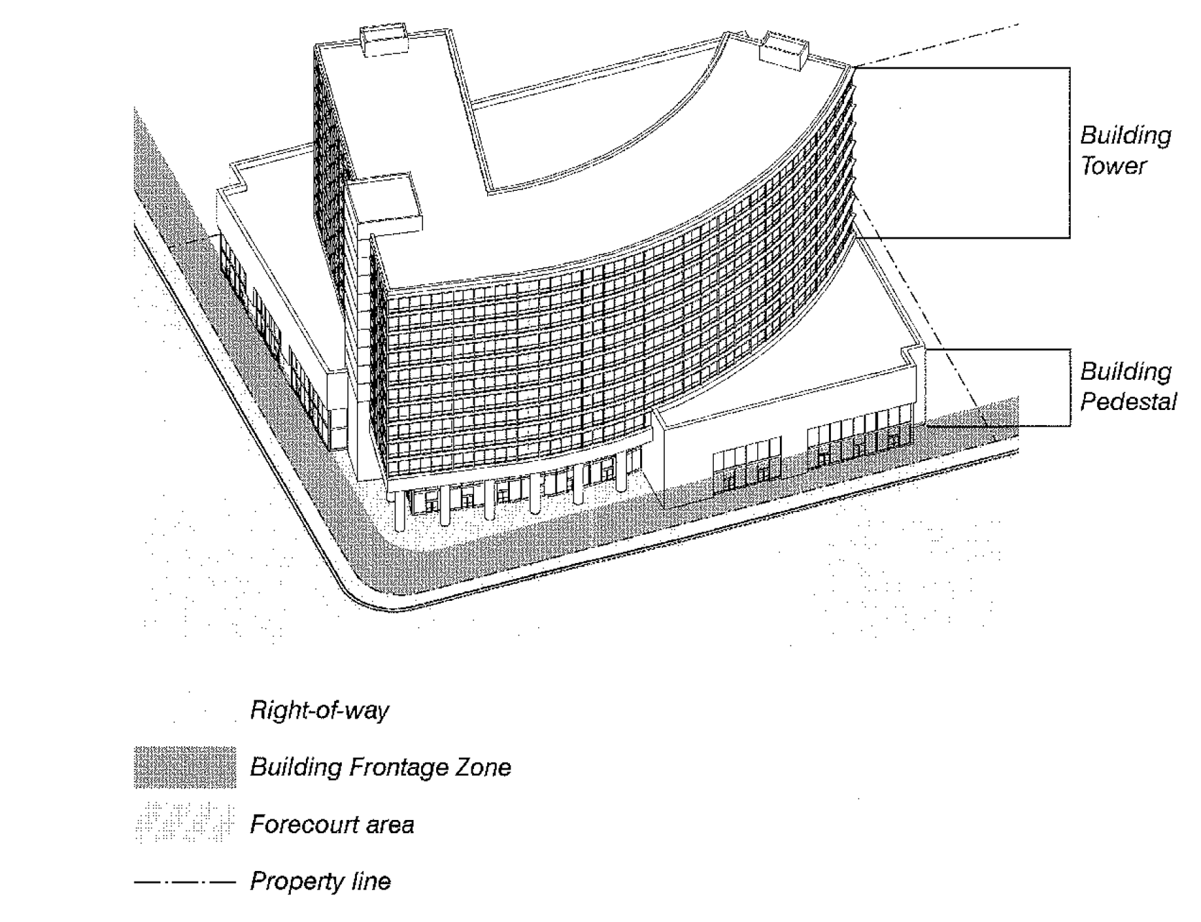 Forecourt: an open area where the building pedestal is recessed outside of the building frontage zone.