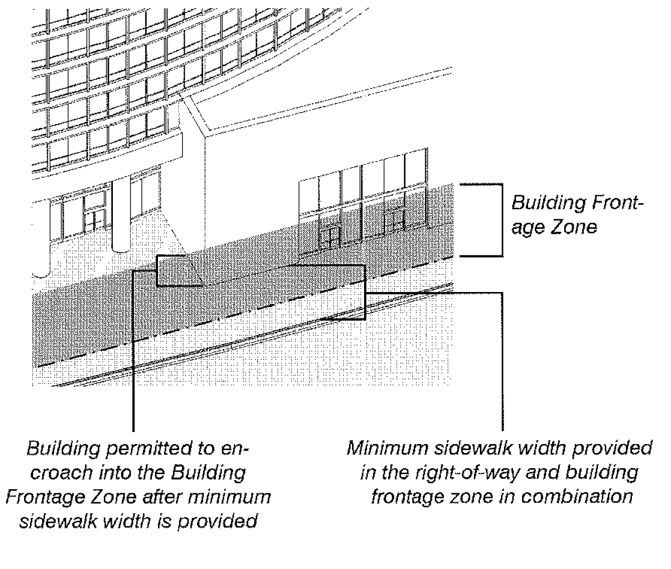 Building Frontage Zone: The portion of a lot adjoining a street or right-of-way. The width of the building frontage zone is established by the applicable street type and/or Sub-district.