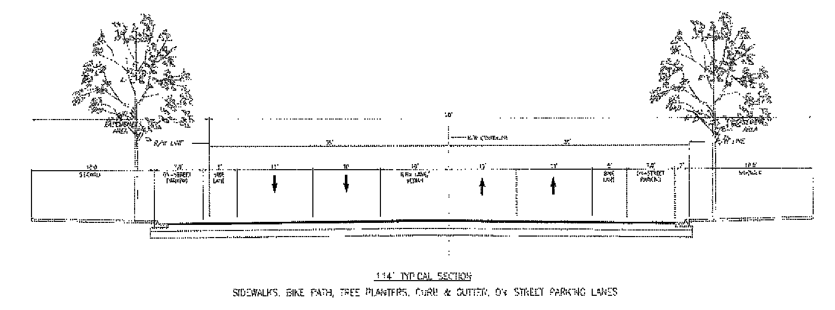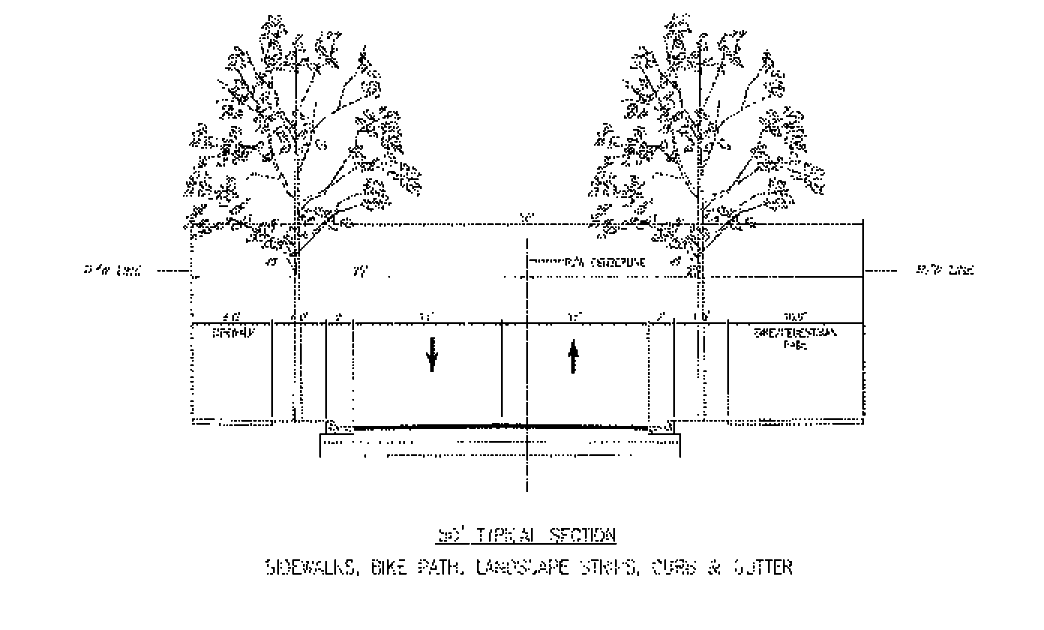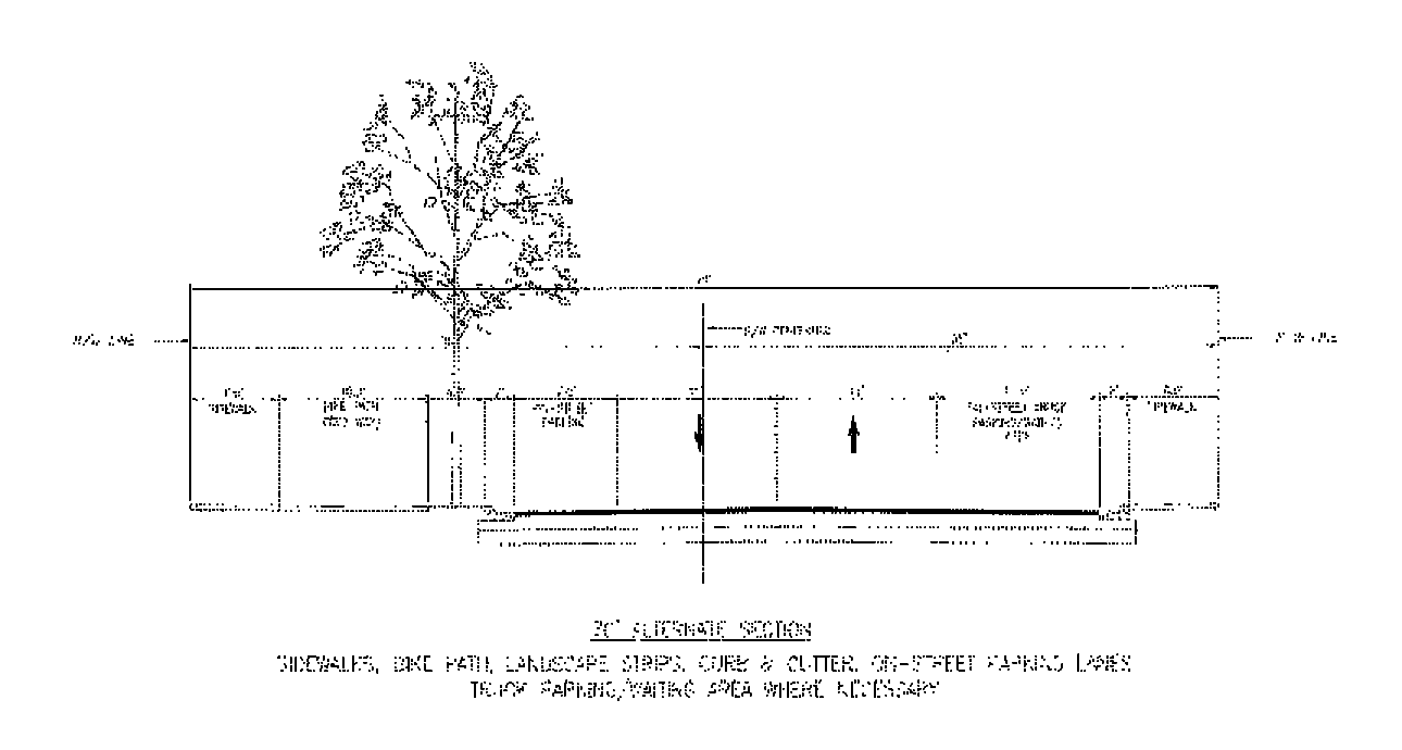 Street Trees: Street trees shall be placed along "A", "B", "C" and "E" Streets at a maximum average spacing of thirty-five (35) feet on center. Street trees shall have a minimum caliper of six (6) inches and shall have a minimum clear trunk of eight (8) feet at the time of planting. Where palms are used as street trees they shall be placed at a maximum average spacing of twenty-five (25) feet on center. Street trees shall be planted in one or more of the following methods of installation: