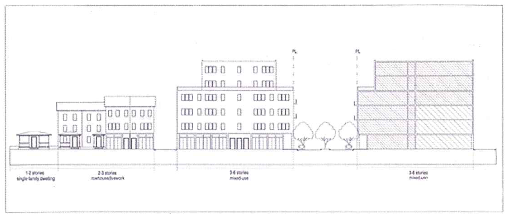 Example of building heights transition from mixed-use to single-family