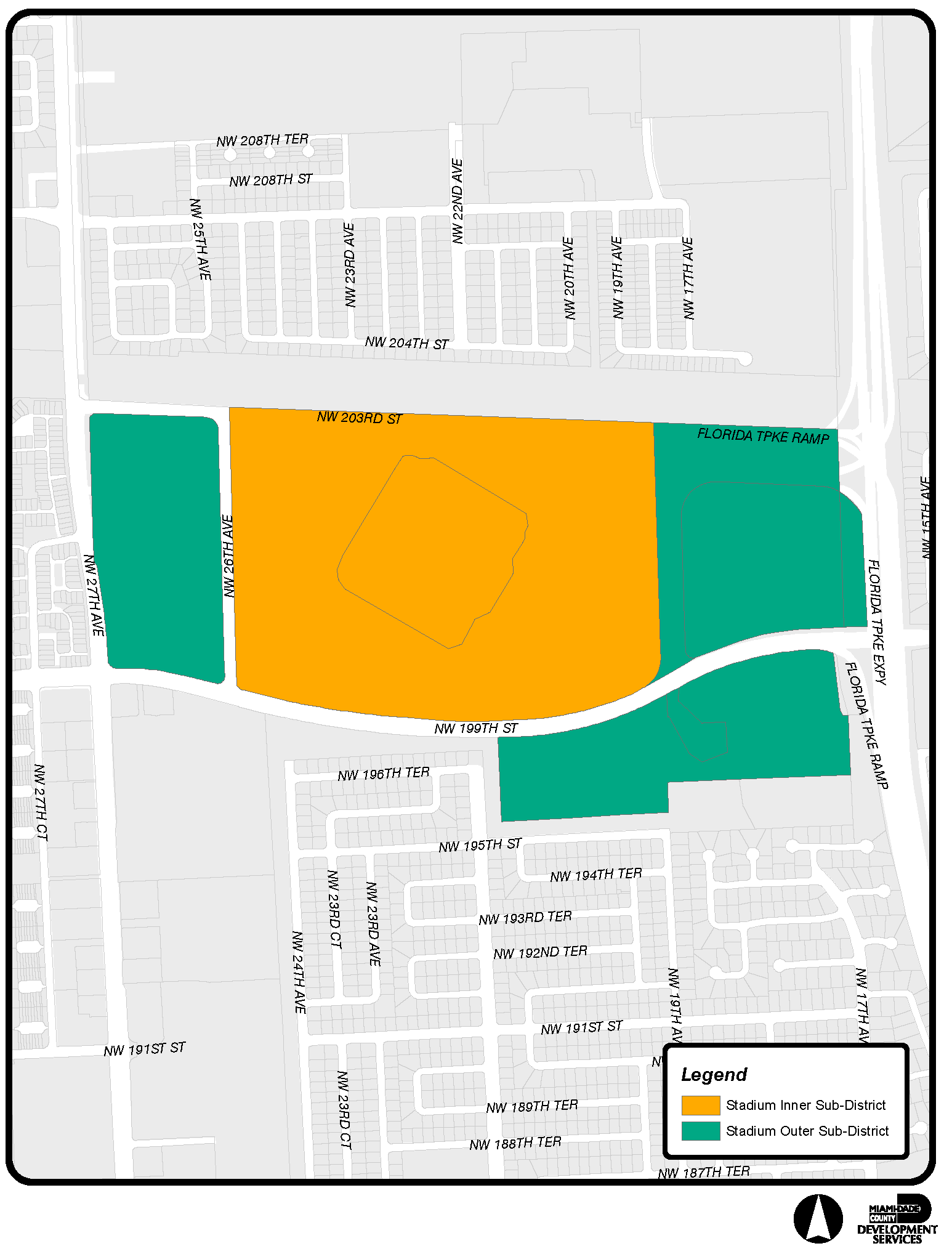 This article applies to the area bounded by N.W. 203rd Street on the north, the Florida Turnpike on the east, N.W. 195th Street on the south, and N.W. 27th Avenue on the west, hereinafter referred to as the Stadium District (S District). A more detailed legal description of this boundary is maintained on file with the Miami-Dade County Department of Regulatory and Economic Resources or successor entity (the "County Department") and with the City of Miami Gardens Planning and Zoning Department (the "City Planning and Zoning Department").