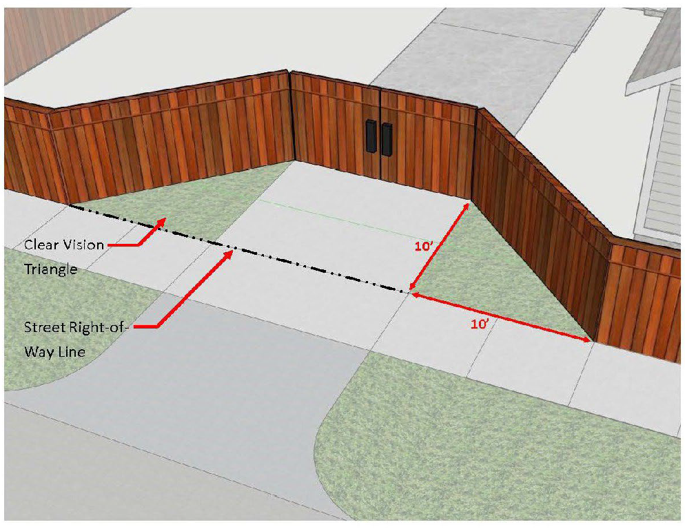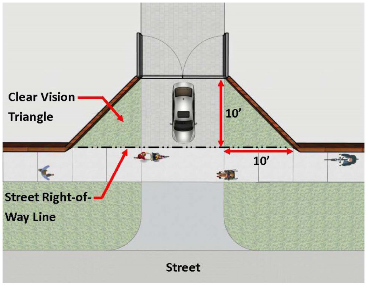 Sight triangle. Safe site distance triangles are required at each intersection of public roads or entrance from a private road or driveway onto a public road. Safe site distances triangle areas are calculated from the viewpoint of a car that will be turning onto or crossing the public road, as shown in the table and graphics below. No proposed landscape vegetation that is two and one-half feet tall or taller (or that will grow above two and one-half feet) may be proposed within the safe site distance triangle. No hardscape elements (rocks, walls, fences, etc.) two and one-half feet tall or taller may be proposed within the safe site distance triangle. Requests for waivers of the site triangle requirements must be made in writing to the director of public works.