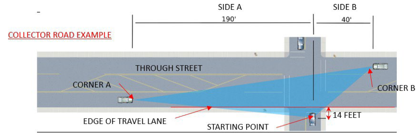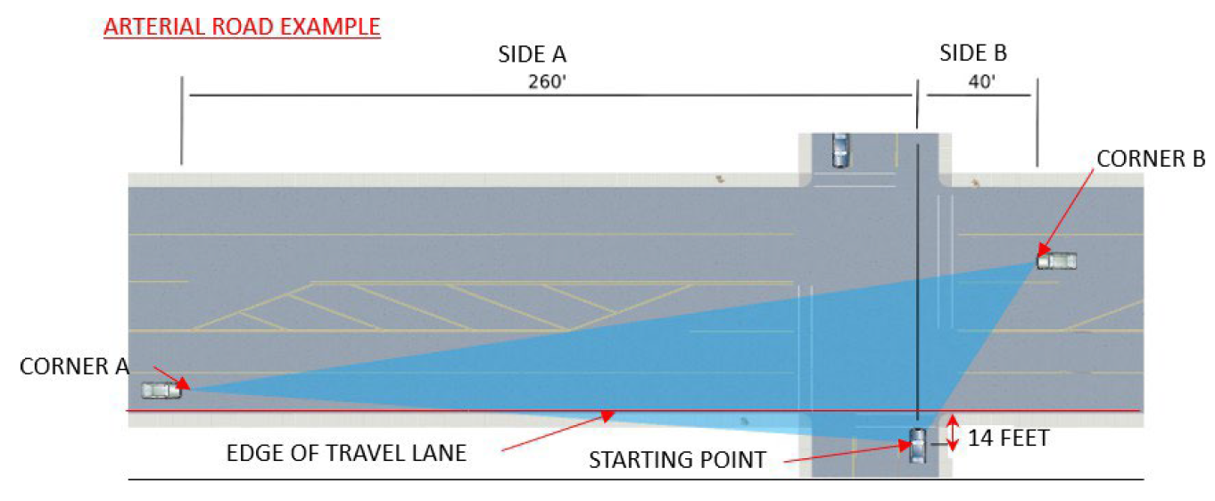 *Begin site triangle from a point in the center of the lane or driveway entering the through street, 14 feet back from the edge of the closest travel lane of the through street. The length of Side A is determined by measuring from the starting point and going perpendicular to the left. The actual corner (Corner A) of the triangle is placed at the center of the closest travel lane approaching from the left. The length of Side B is determined by measuring from the starting point and going perpendicular to the right. The actual corner (Corner B) of the triangle is placed at the center of the closest travel lane approaching from the right.