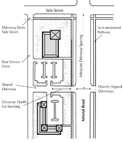 The number of access points may be reduced where the enforcement official determines that there may be a beneficial effect on traffic operations and safety, while preserving the property owner's right to reasonable access. In this case, a shared driveway, frontage street or rear service drive connecting two or more properties or uses may be required. Service streets may be required near existing traffic signals or near locations having potential for future signalization; along major thoroughfares with high traffic volumes; and where there are a relatively high number of crashes or there is limited sight distance. Shared access or cross access shall be required between all sites that are in the same or similar zoning district (e.g. between all adjacent commercially zoned properties).