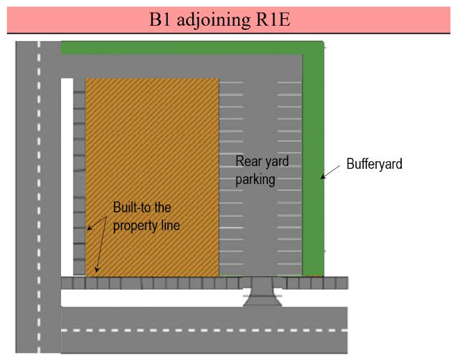 Off-street parking shall be located to the side or rear of the building (see B1 adjoining R1E below).