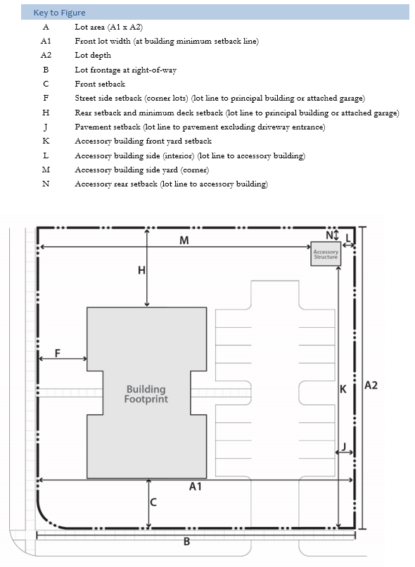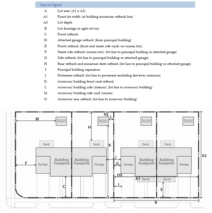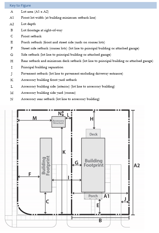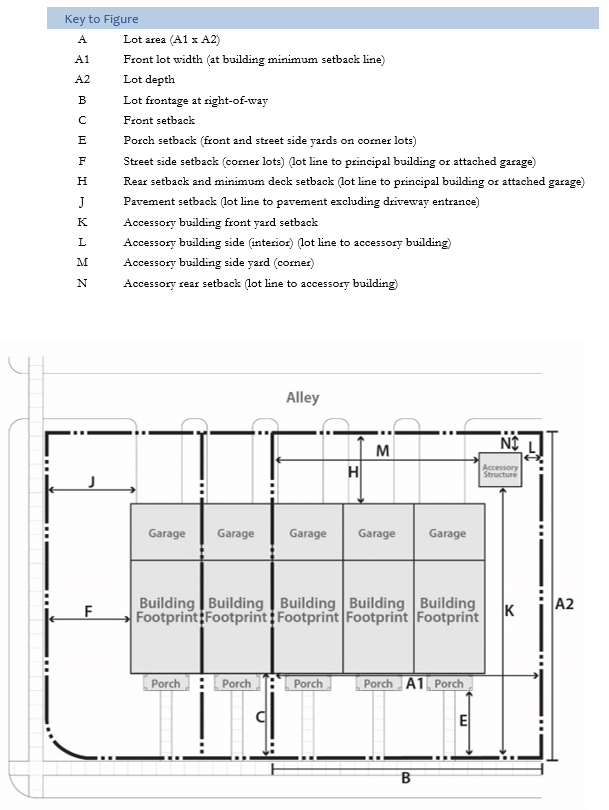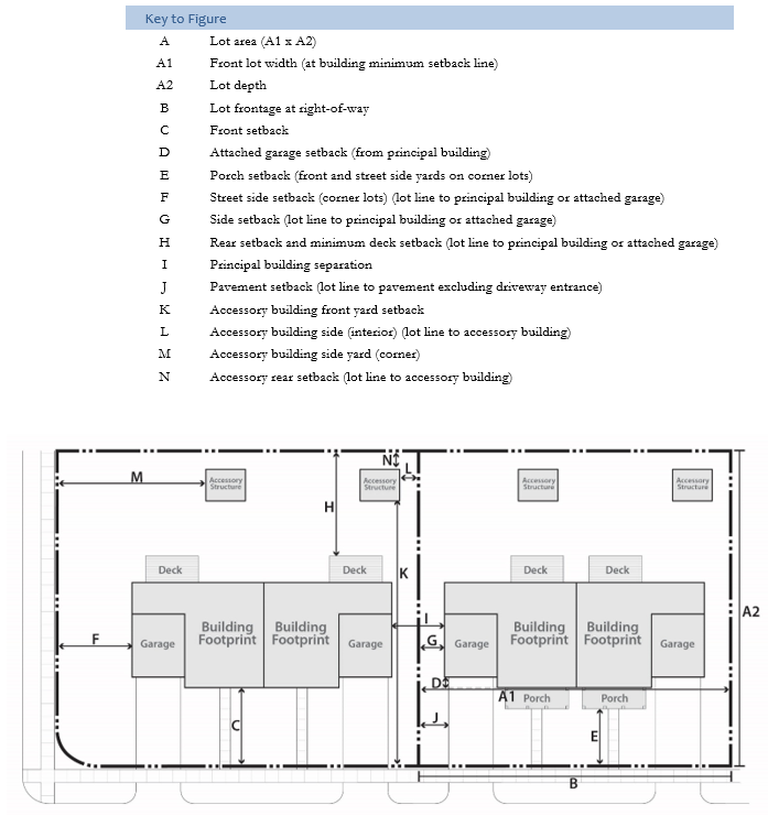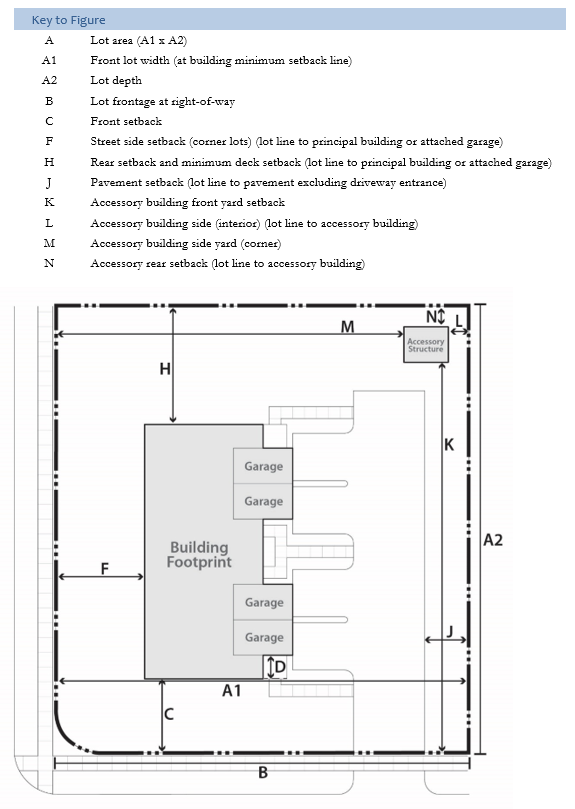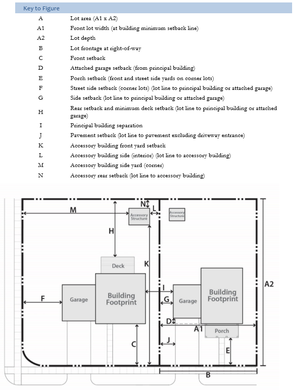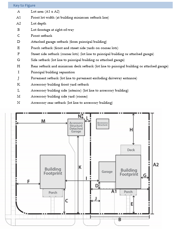 The following figure is intended to provide a graphic depiction of the setback and dimensional requirements for Apartment land uses. Specific requirements for Apartments can be found in Article II under the density, intensity, and bulk requirements for each residential zoning district.