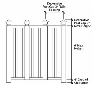 Decorative posts at a minimum spacing of twenty-four (24) inches may extend 8 inches above the maximum height. See Figure 10.06.40b.