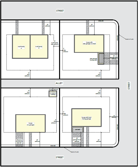 | Zone | Front Yard | Single Yard (Single Family) | Side Yard (Multi-Family) | Street Side Yard | Rear Yard Main Building | Rear Yard Accessory Building |