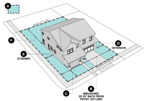 (B) | Min. Front Setback (C) | Residential Use Min. Side Setbacks on interior Lots or Parcels (D) | Residential Use Min. Side Setbacks on corner (E) | Civic/Institutional and Non- Residential Use Min. Side Setback | Min. Rear Setback (F) | Max. Lot or Parcel Coverage |