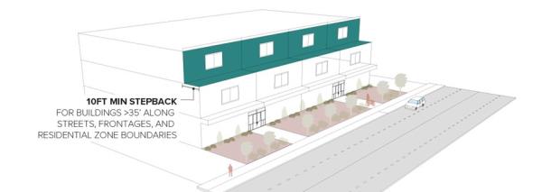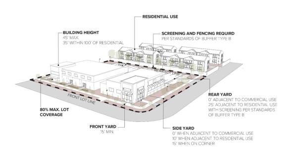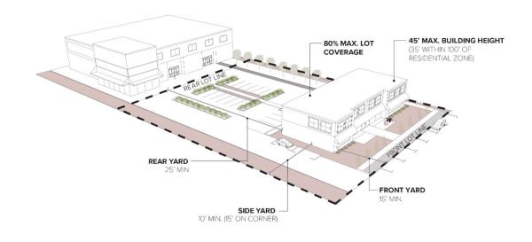 | Maximum building height | 45’ | 45’, 35’ within 100‘of a Residential Zone Boundary |