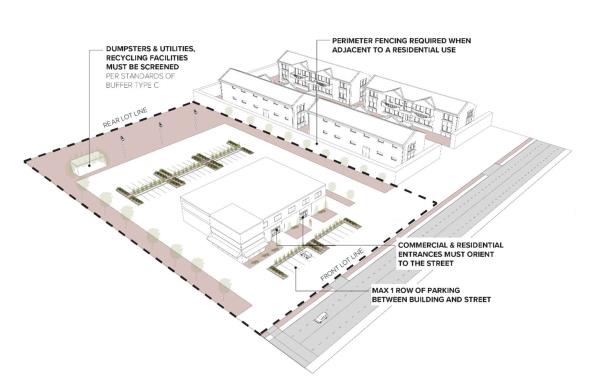 | Commercial Parking Lot or Commercial Parking Garage | C | Parking garages shall include non-residential uses for at least 75% of the ground story facing a public street. |