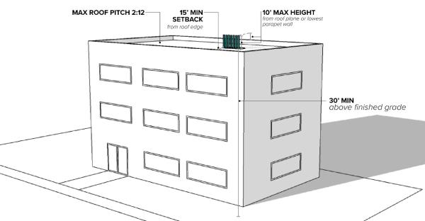 Roof-mounted wireless telecommunication facilities shall satisfy the following standards, as depicted in Figure 18.75.