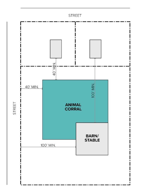 | Animals for Commercial Production | A | As determined by the conditional use permit | 1. 1-acre minimum lot or parcel size. 2. Stables are located at a minimum of 100’ from dwellings and street. (1) 3. Enclosures, aviary, coops, apiary, and hutches located at a minimum of 40’ from dwellings and street. (1) |