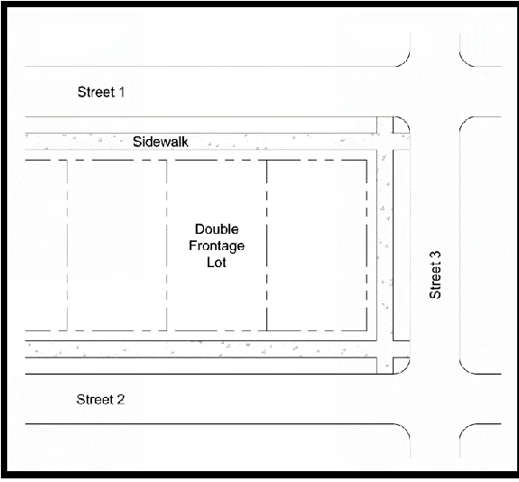 Street, frontage: All of the property fronting on one side of a street between two intersecting streets, or in the case of a dead-end street, all of the property along the side of the street between an intersecting street and the end of such dead-end street.
