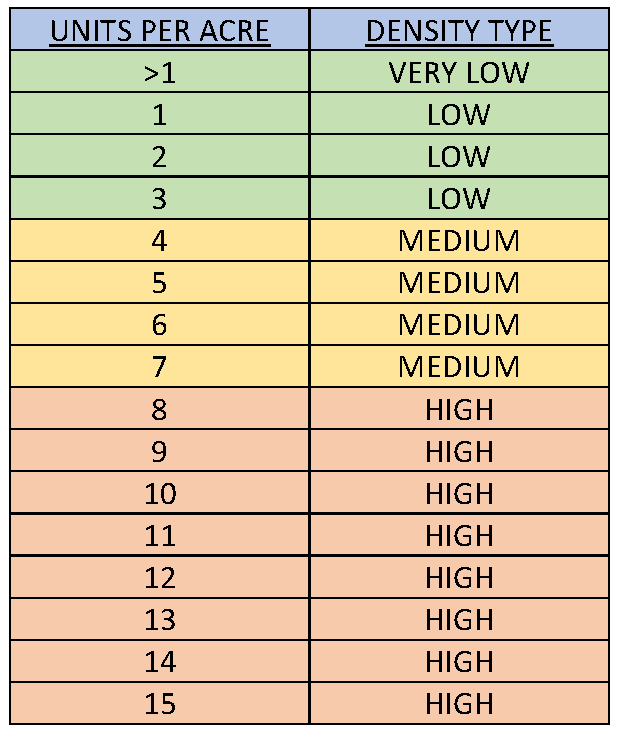 Density: The number of dwelling units per gross acre of land, including all streets and open space. The following is breakdown of density defined by the zoning ordinance: