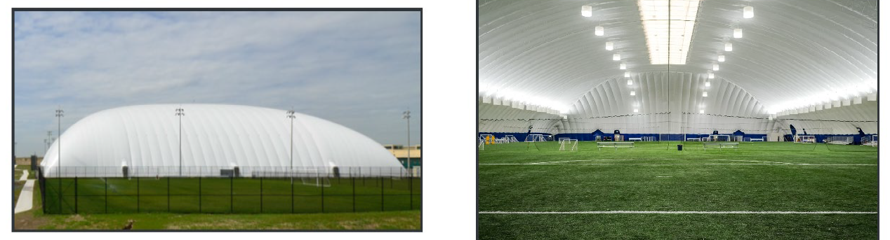 Dome air-supported structure (dome or bubble): Dome structure supported by continuous supply of air, resulting in a complete open-span interior that is unobstructed by columns or support beams. Can be designed for permanent, seasonal, or temporary installation. Designed, engineered, and constructed to meet or exceed all local windspeed and snow load requirements and conform with applicable International Building Code.