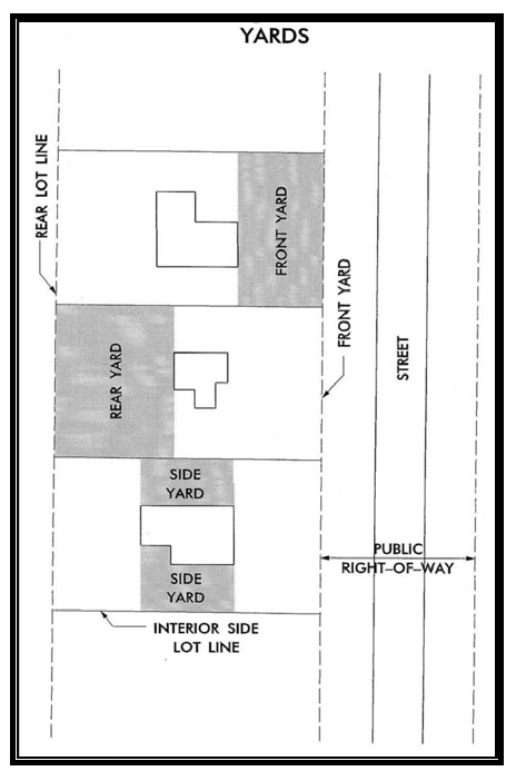 Yard: A space open to the sky between a building and the lot lines of the parcel of land on which the building is located, unoccupied or unobstructed by an encroachment or structure except as otherwise provided by this chapter. (See Figure 2-12).