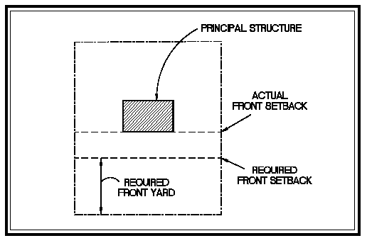 Setback, actual: The minimum horizontal distance between the principal building, excluding steps and unenclosed porches and the lot line. In the case of a lot on a cul-de-sac or curvlinear street, the setback is measured from the midpoint of the lot width on the front lot line. (See Figures 2-8 and 2-9)