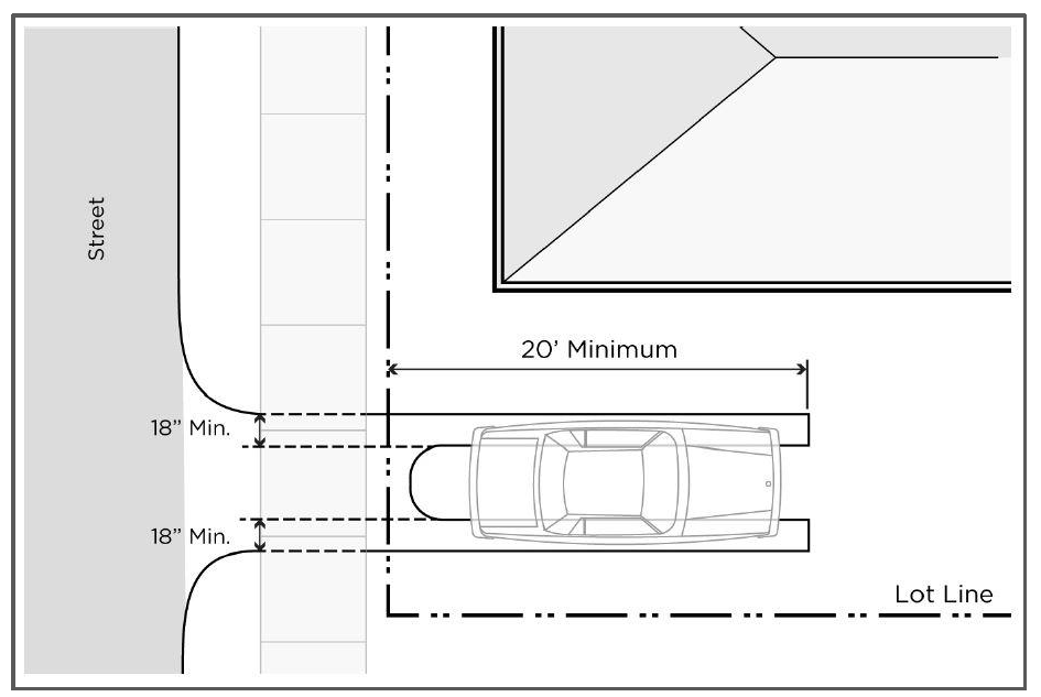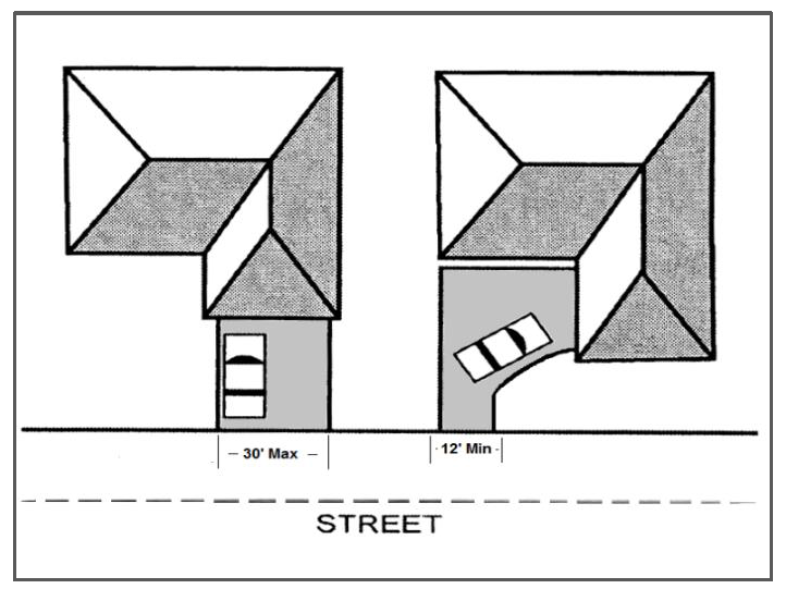 A residential driveway that provides access to a detached or attached garage is limited to a maximum width of 30 feet and a minimum of 12 feet.