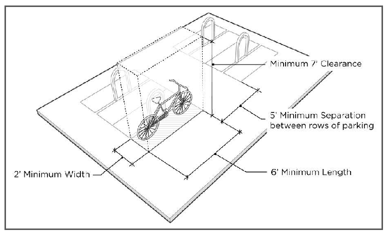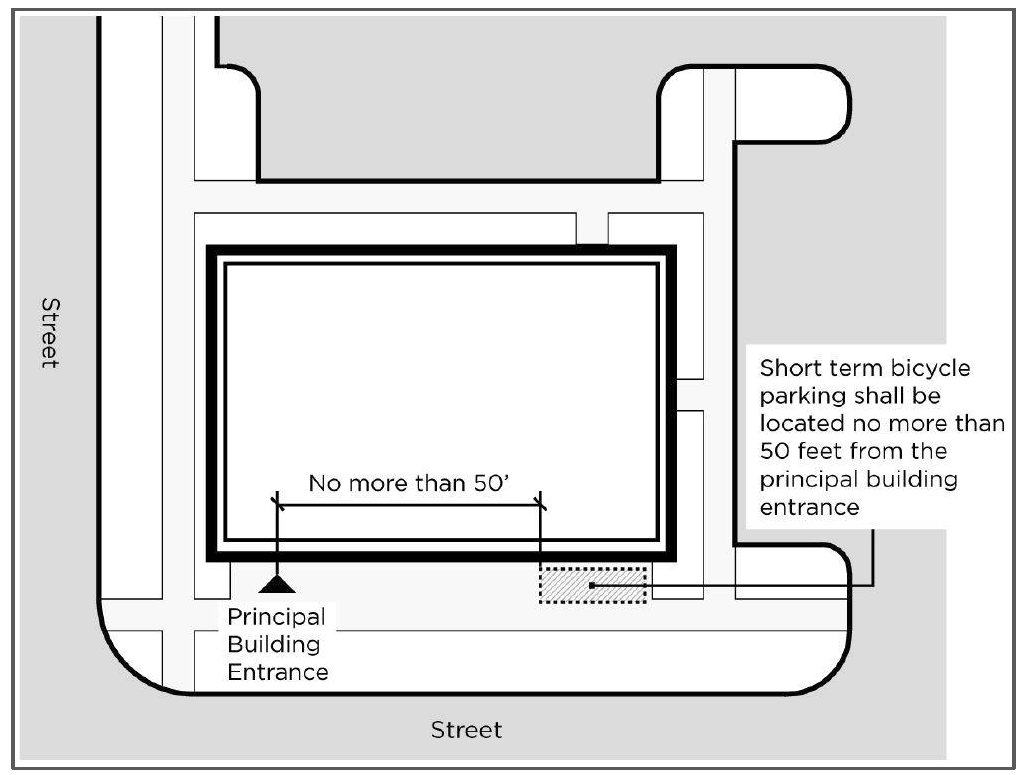 Certain uses listed within Table 14.2.1 are required to provide bicycle parking spaces when located within all Residential districts, and within the R-C1, D-CM and SSC-RC Zoning districts. Required bicycle spaces should be designed as short-term spaces, which are areas where bicycles will be left for short stops, requiring a high degree of convenience.