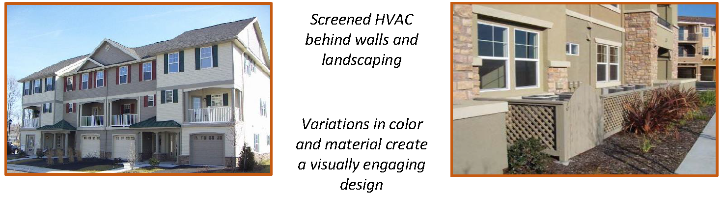 All ground or roof-mounted mechanical, HVAC, and like systems shall be screened from public street view (within 300 feet) on all sides by an opaque wall or fence made of brick, stucco, split face block, or landscaping.